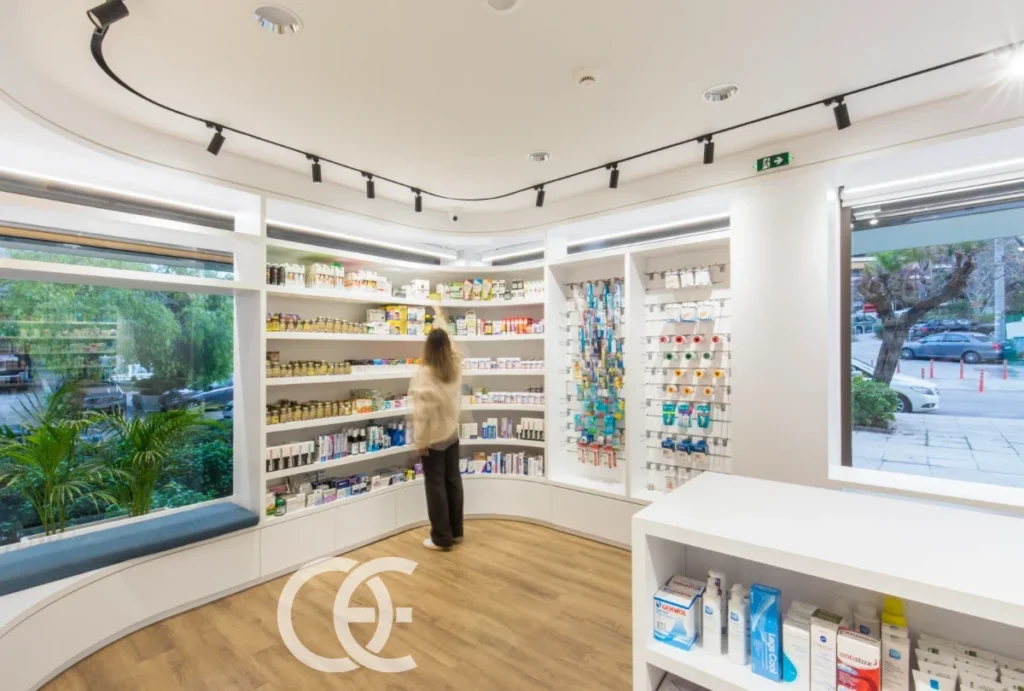 Das helle Licht und das reflektierende Glasdesign verstärken die visuelle Attraktivität und schaffen ein großzügiges und ansprechendes Einkaufserlebnis. Das grüne LED-Akzentlicht verleiht eine charakteristische Apotheken-Atmosphäre und bewahrt gleichzeitig eine saubere, hochwertige Einzelhandelsästhetik.
