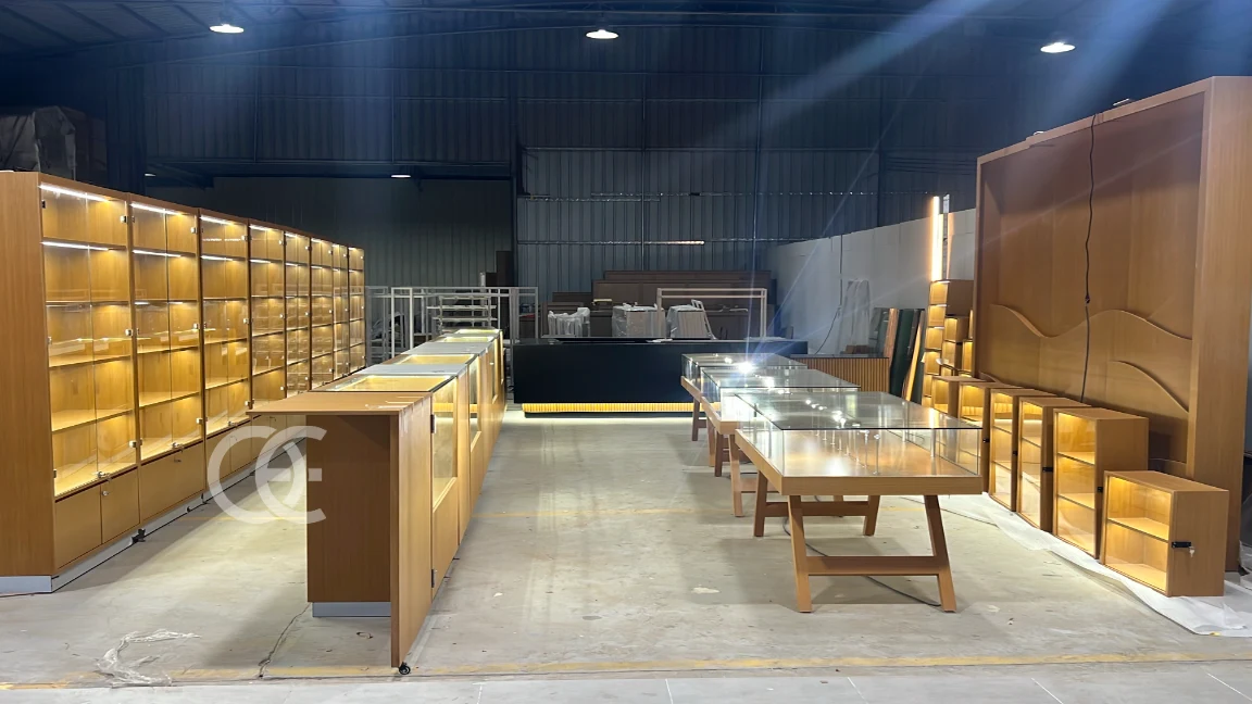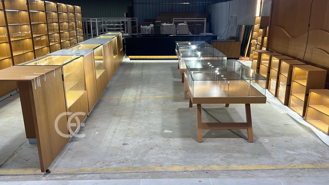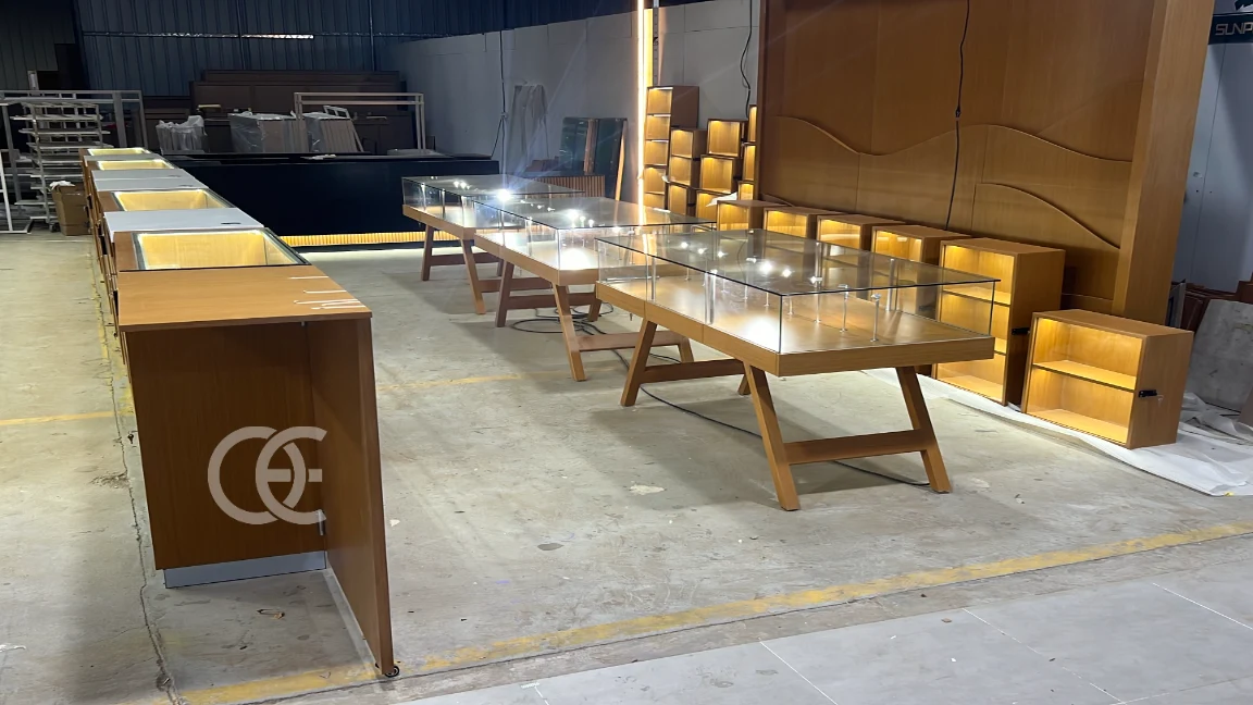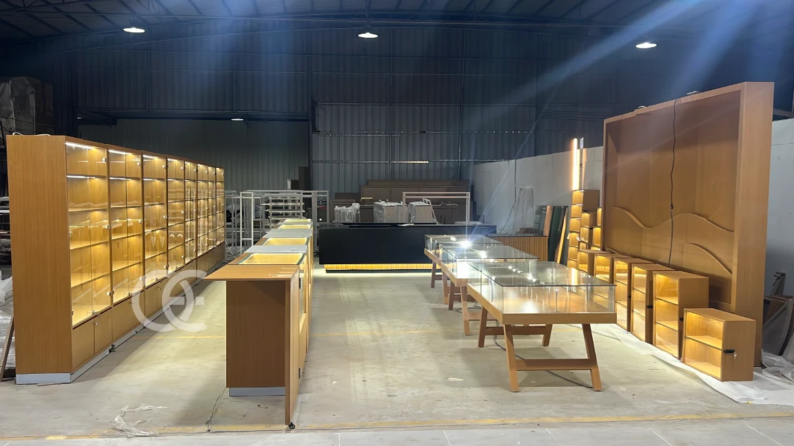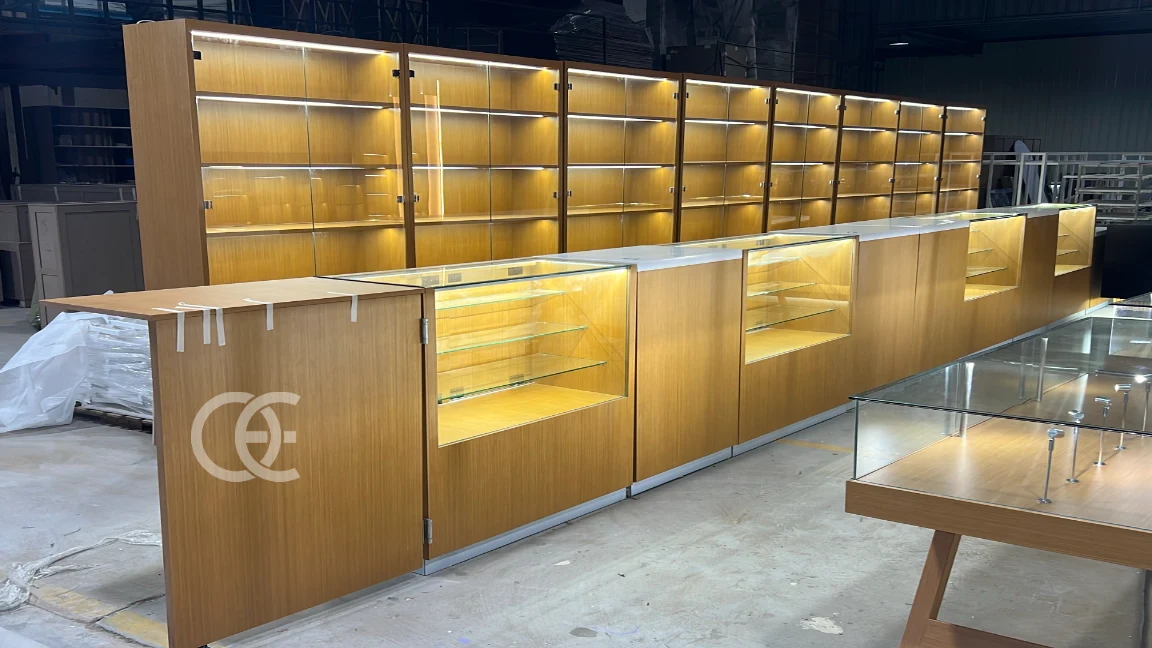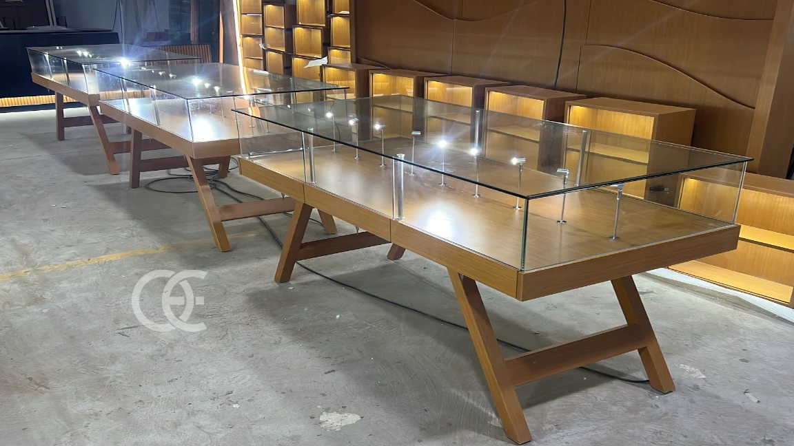 Die warme bernsteinfarbene Beleuchtung betont die Textur des Naturholzes, während die Glasflächen den Raum offen und modern halten. Zusammen schaffen sie ein stimmiges Einzelhandelsumfeld, das Ästhetik mit Funktionalität verbindet.