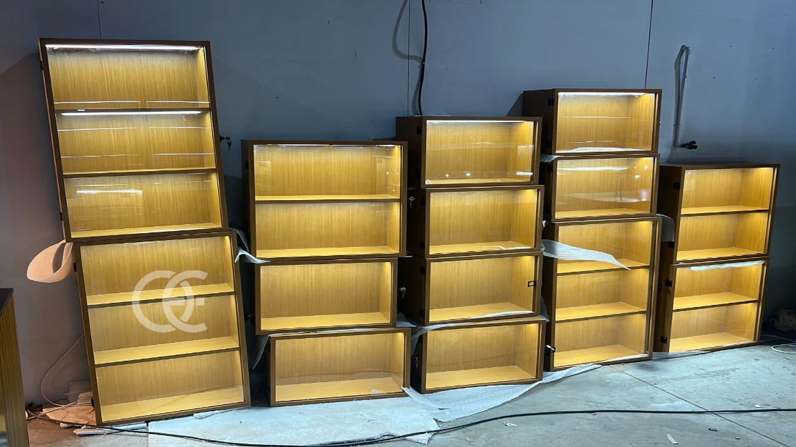 Ouyee entwirft und fertigt elegante Cannabis-Wandschränke mit Regalen die warme Holztöne mit klarem Glas und integrierter Beleuchtung kombinieren. Diese Schränke schaffen eine hochwertige und zugleich einladende Atmosphäre – perfekt für Apotheken und Rauchläden, die einen natürlichen, hochwertigen Look anstreben.