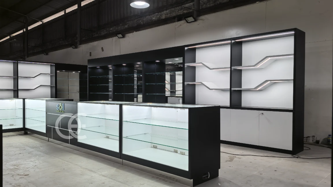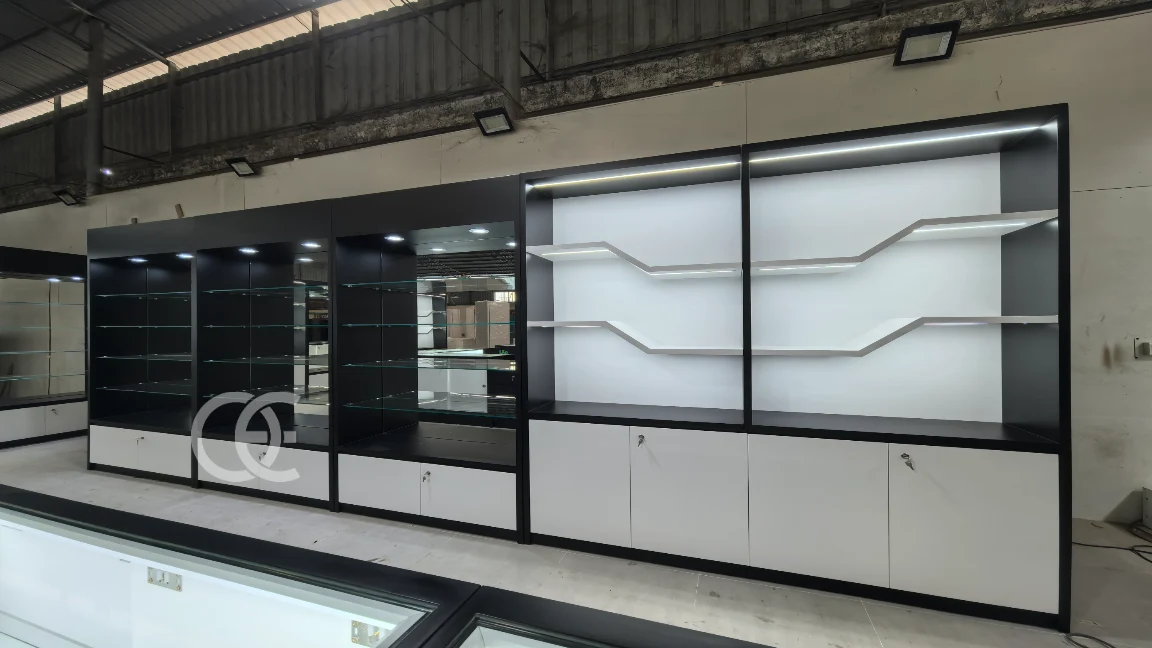 Diese modularen Vitrineneinheiten sind so konzipiert, dass sie hohe Sichtbarkeit bieten und gleichzeitig das Inventar organisiert und sicher halten. Der Kontrast von mattem Metallrahmen mit heller Beleuchtung verleiht Tiefe und Klarheit, während das Layout den Kundenverkehr und die Kundenbindung in den Produktzonen maximiert.