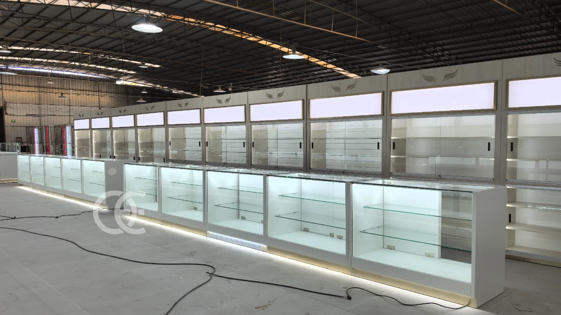 Ouyee bietet hochwertige Maßgeschneiderte Auslagekästen für Apotheken und Apotheken- und Drogistendisplays Entwickelt für professionelle Cannabis- und Pharmaeinzelhandelsflächen in Deutschland. Dieses Projekt verfügt über ein elegantes weißes Layout mit LED-Beleuchtung, Sicherheitsglas-Auslagen und sauberen, modularen Regalen — kombiniert Funktionalität mit einem hochwertigen Ästhetik.
