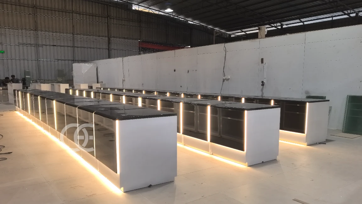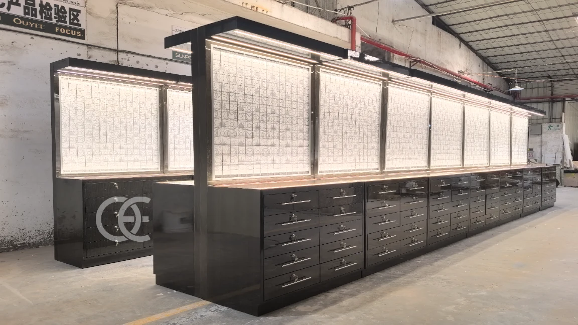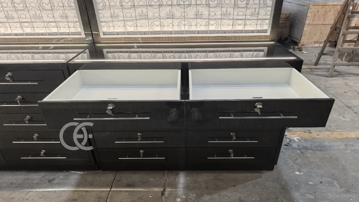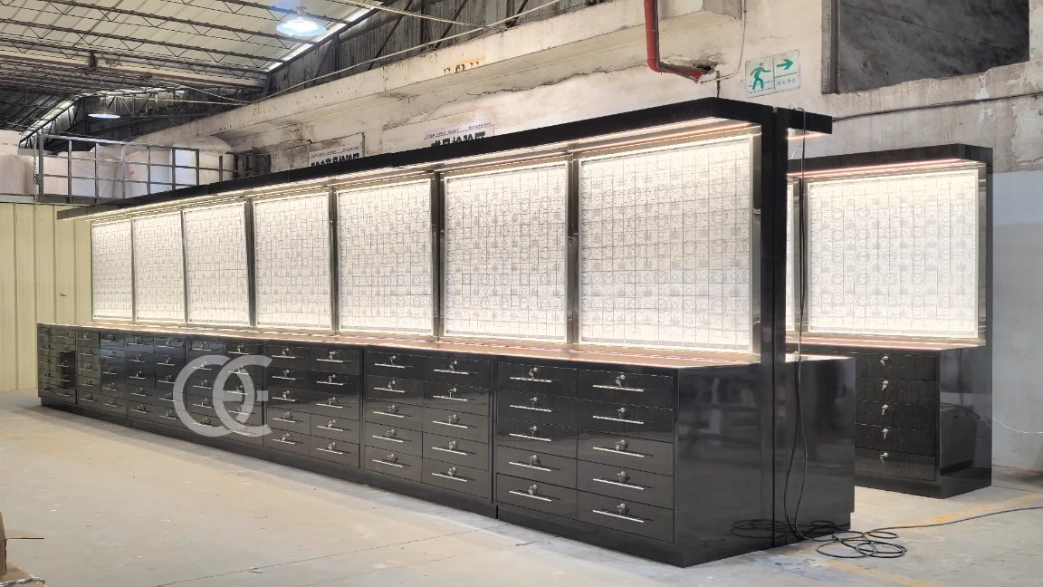 Ouyee Entwirft und produziert maßgeschneiderte Wasserpfeifen-Shop-Ausstellungspräsentationen für Premium-Tabak- und Shisha-Händler in Deutschland. Dieses elegante schwarze Ausstellungsystem kombiniert LED-beleuchtete Paneele mit mehreren abschließbaren Schubladen und bietet sowohl luxuriöse Präsentation als auch praktische Lagerung.