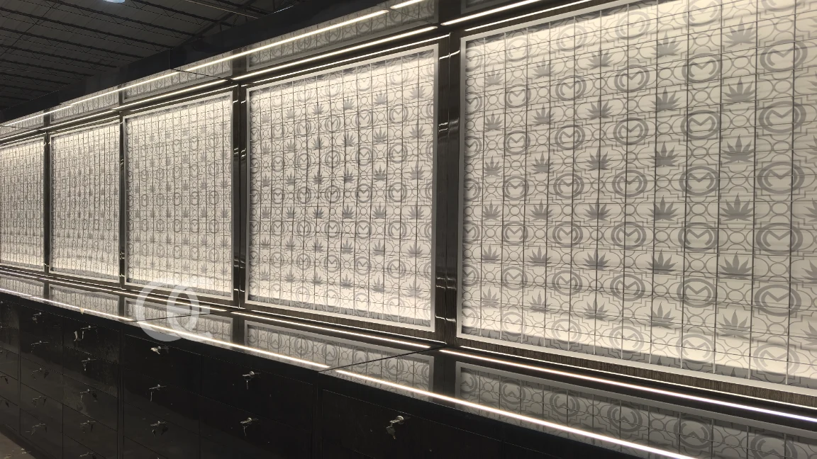 Dieses Setup vermittelt einen anspruchsvollen und professionellen Eindruck, ideal zur Präsentation von Wasserpfeifen, Zubehör und Premium-Tabakprodukten. Die vertikalen beleuchteten Paneele verbessern die Produktpräsentation, während die Schubladen darunter ausreichend Platz für Inventar und Werkzeuge bieten.