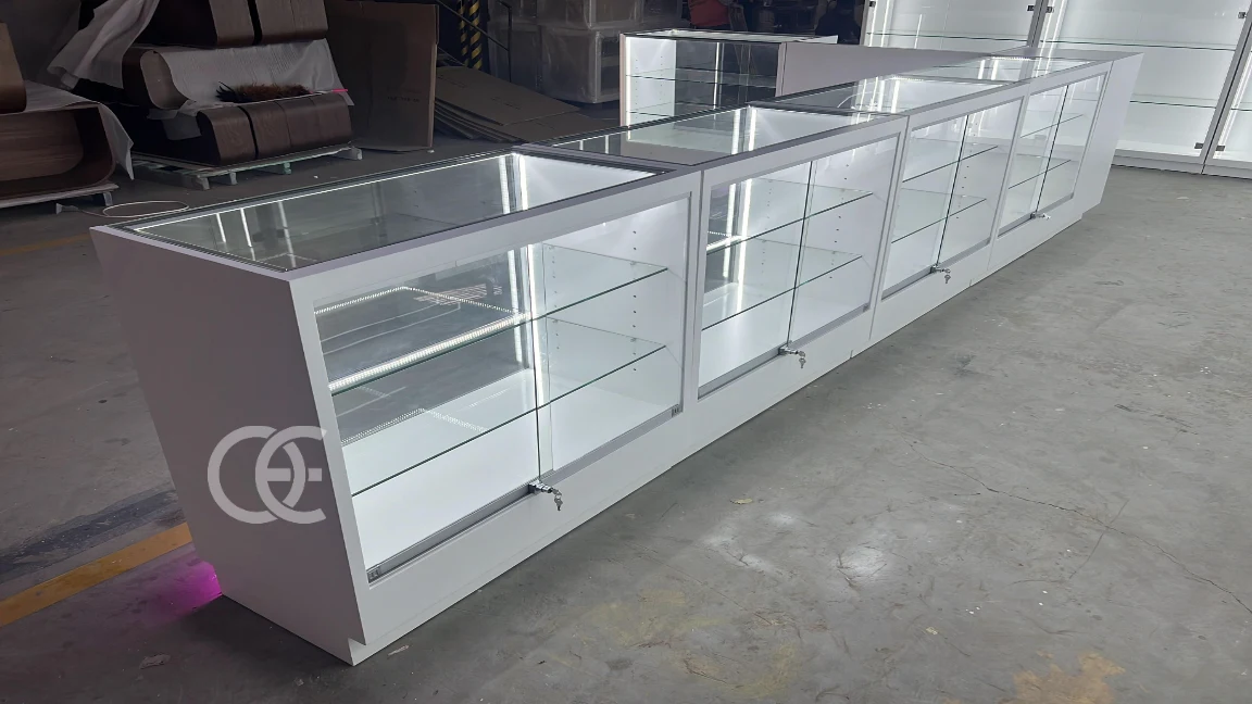 Das helle Licht und die reflektierenden Glasflächen maximieren die Produktpräsenz, wodurch jedes Ausstellungsstück hervorsticht und gleichzeitig einen professionellen, minimalistischen Stil bewahrt. Das modulare Layout ermöglicht einfache Erweiterungen und Anpassungen an jeden Einzelhandelsraum.
