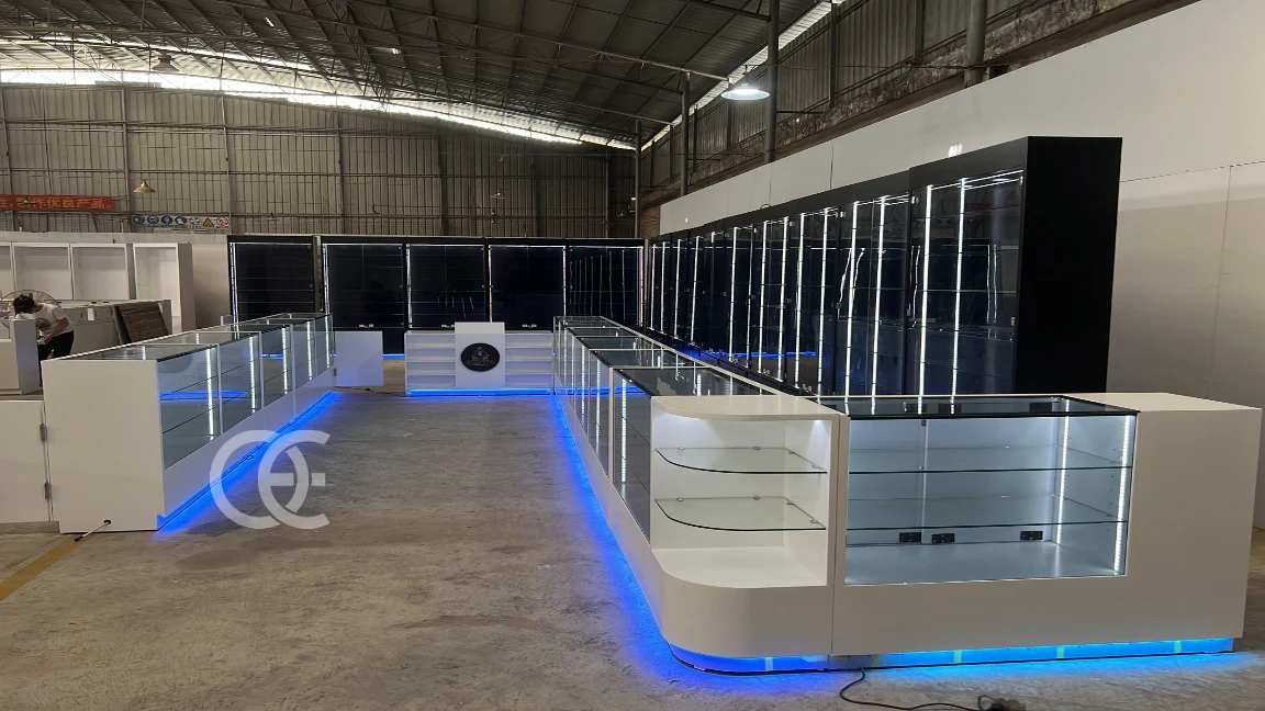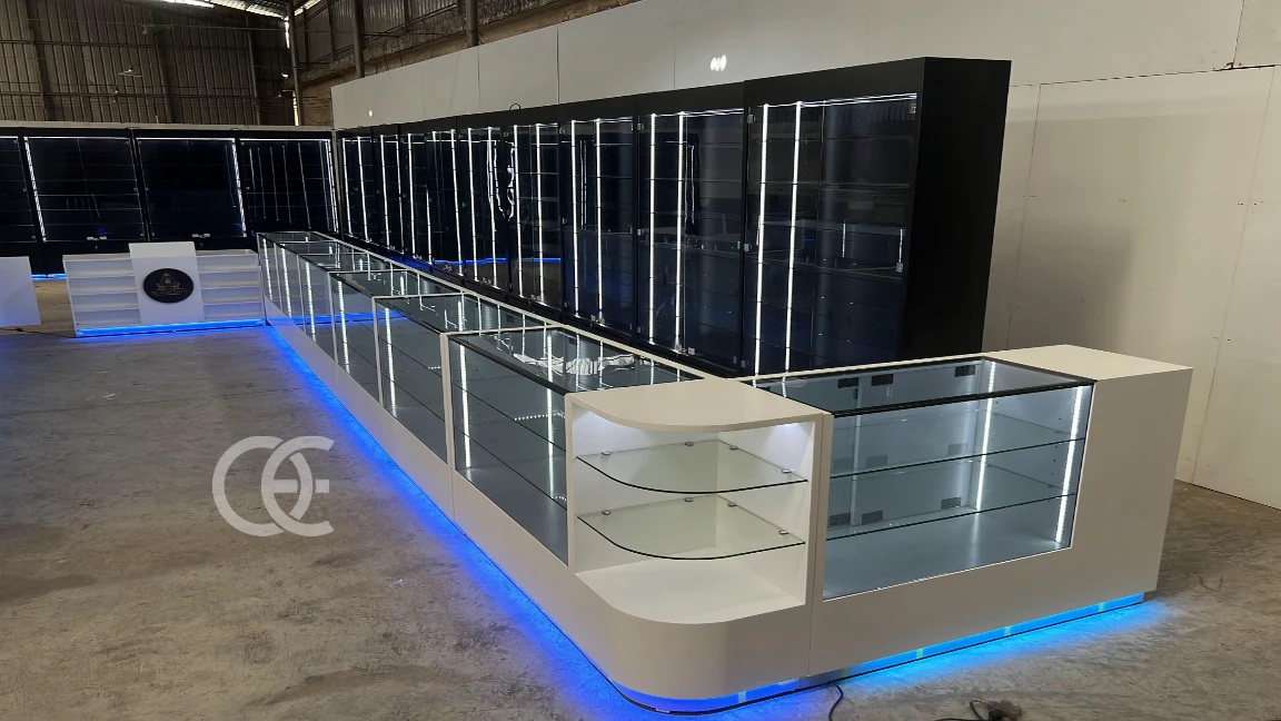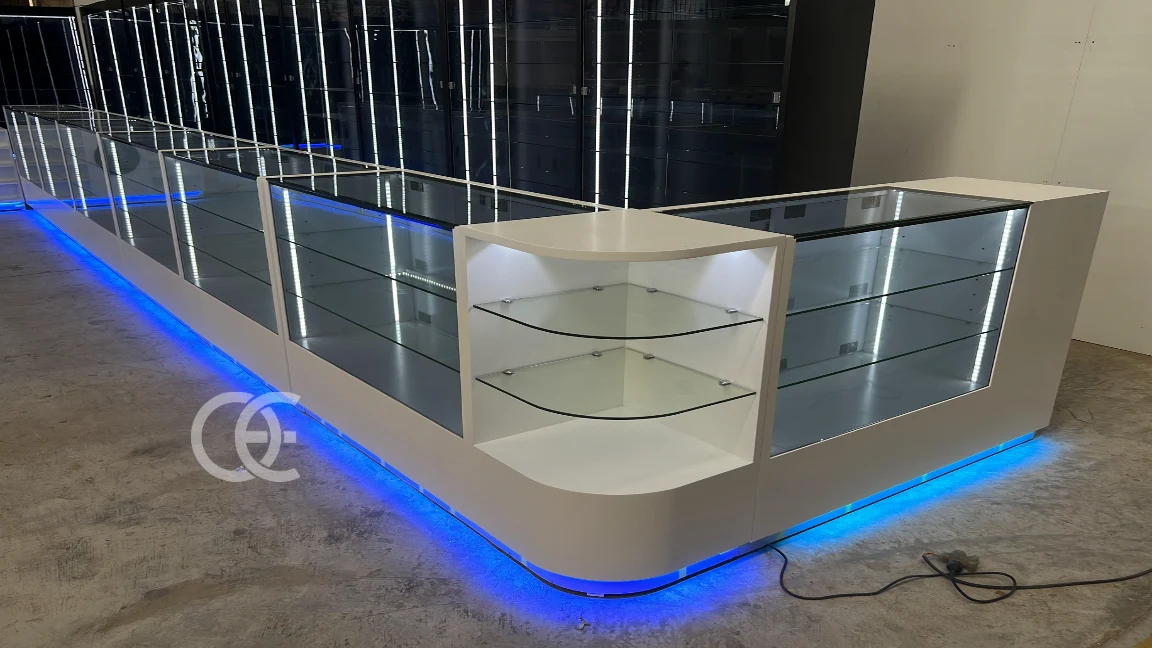 Ouyee Hersteller Großhandels-Dispensary-Ausstellungsstände für Cannabis-, CBD- und Vape-Einzelhandelsgeschäfte, kombiniert minimalistische Ästhetik mit langlebiger Konstruktion. Das Design verfügt über eine schwarz-weiße Kontrastbasis, kristallklare Glasplatten und LED-Akzentbeleuchtung, um jeden modernen Dispensary oder Rauchshop aufzuwerten.