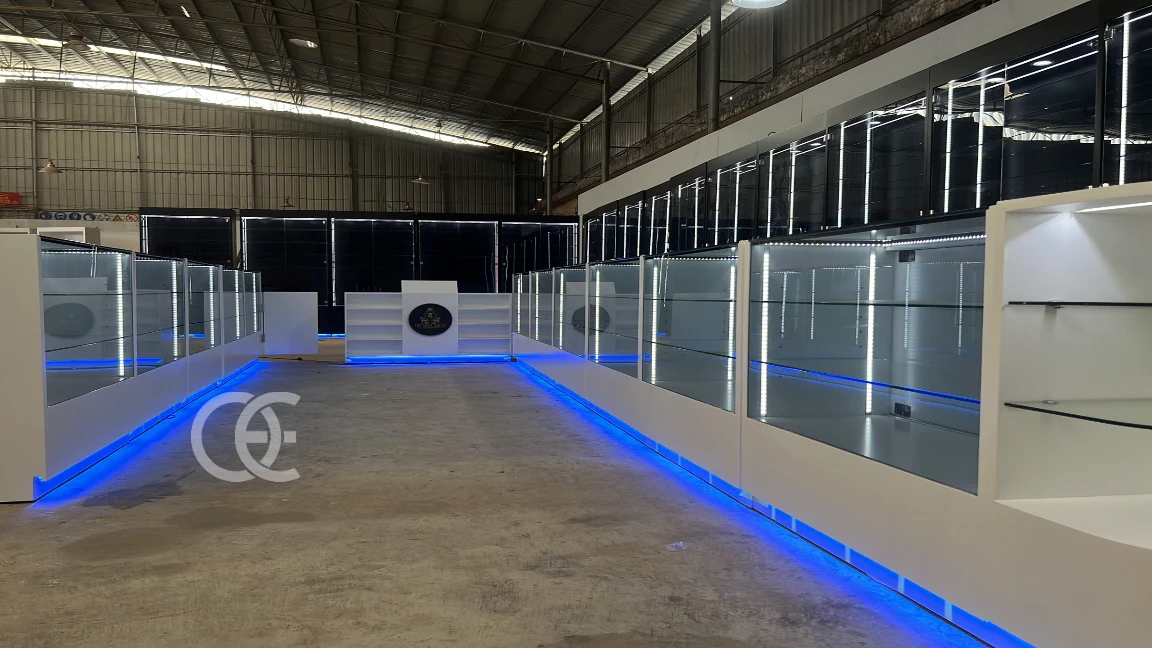 Dieses Setup bietet eine professionelle und futuristische Einzelhandelsumgebung, die die Produktpräsenz und Kundeninteraktion verbessert. Der Kontrast zwischen schwarzen und weißen Oberflächen, gepaart mit blauer LED-Beleuchtung, schafft eine saubere und hochwertige Ästhetik, die sich für luxuriöse Dispensary-Innenräume eignet.