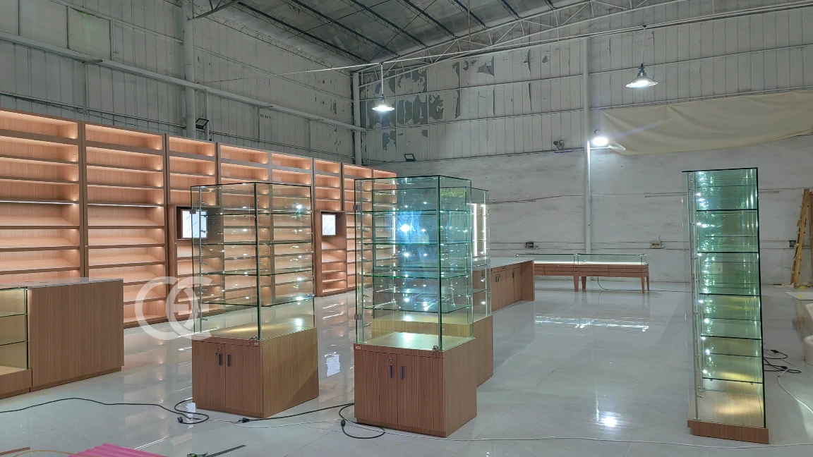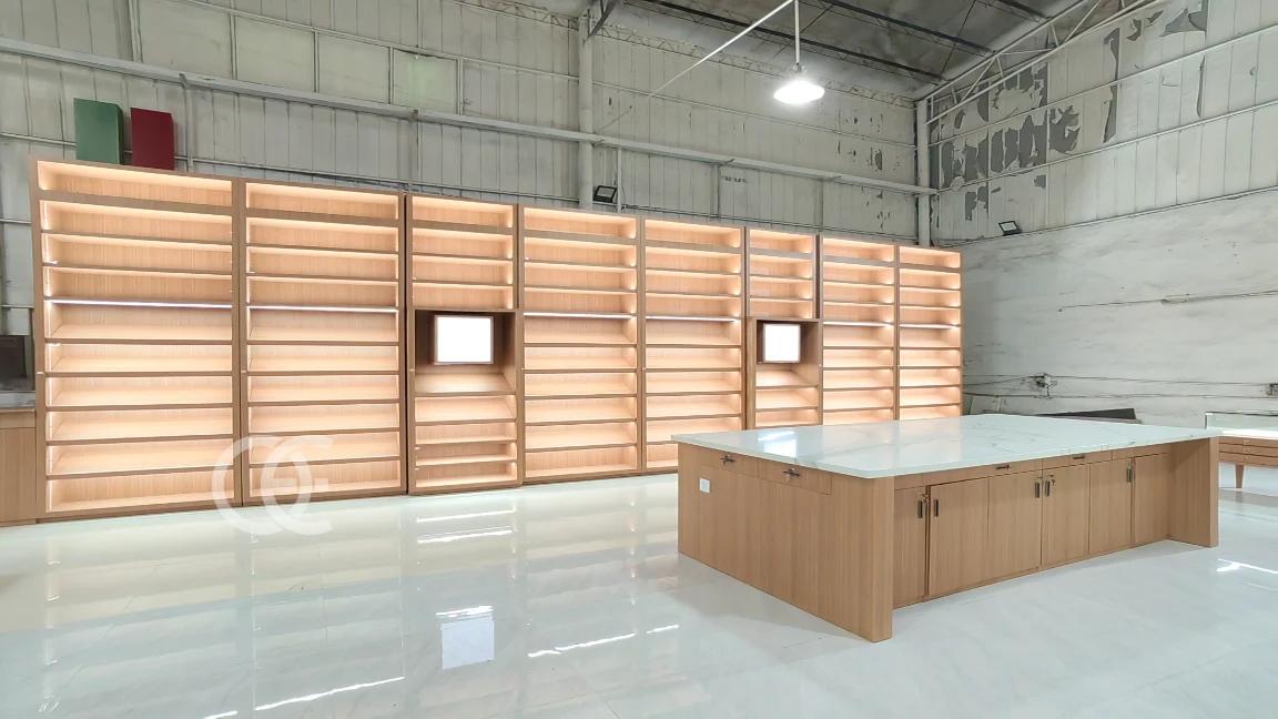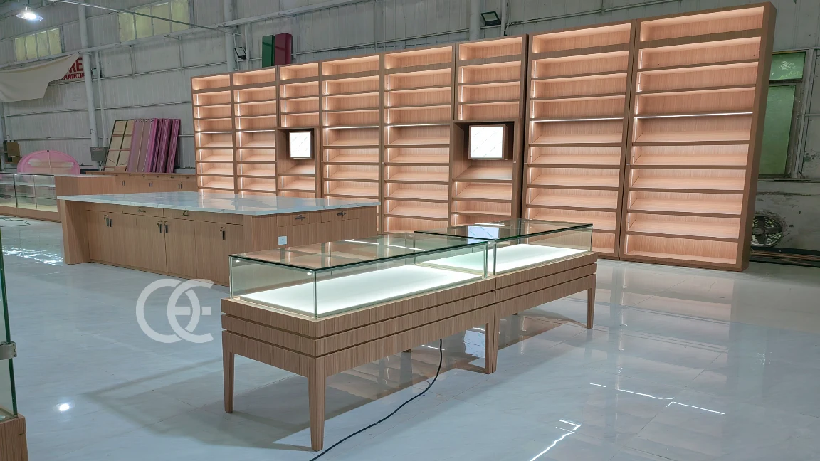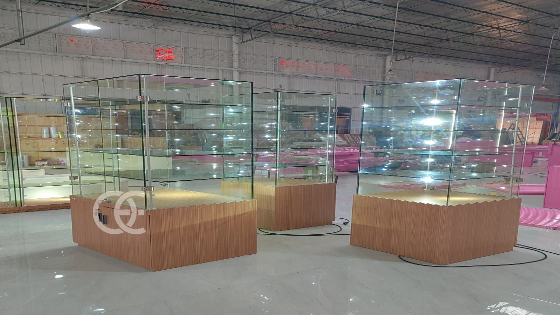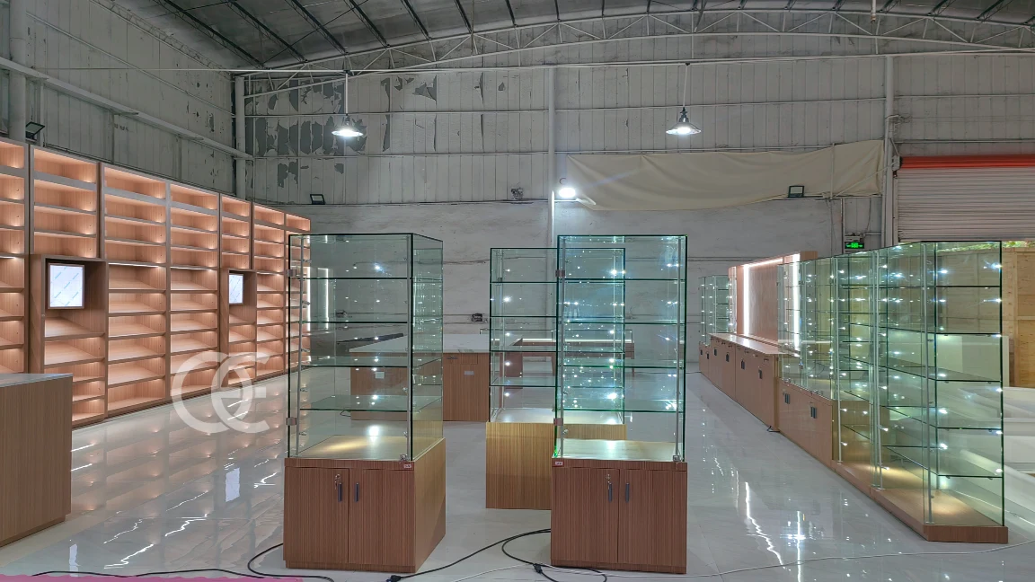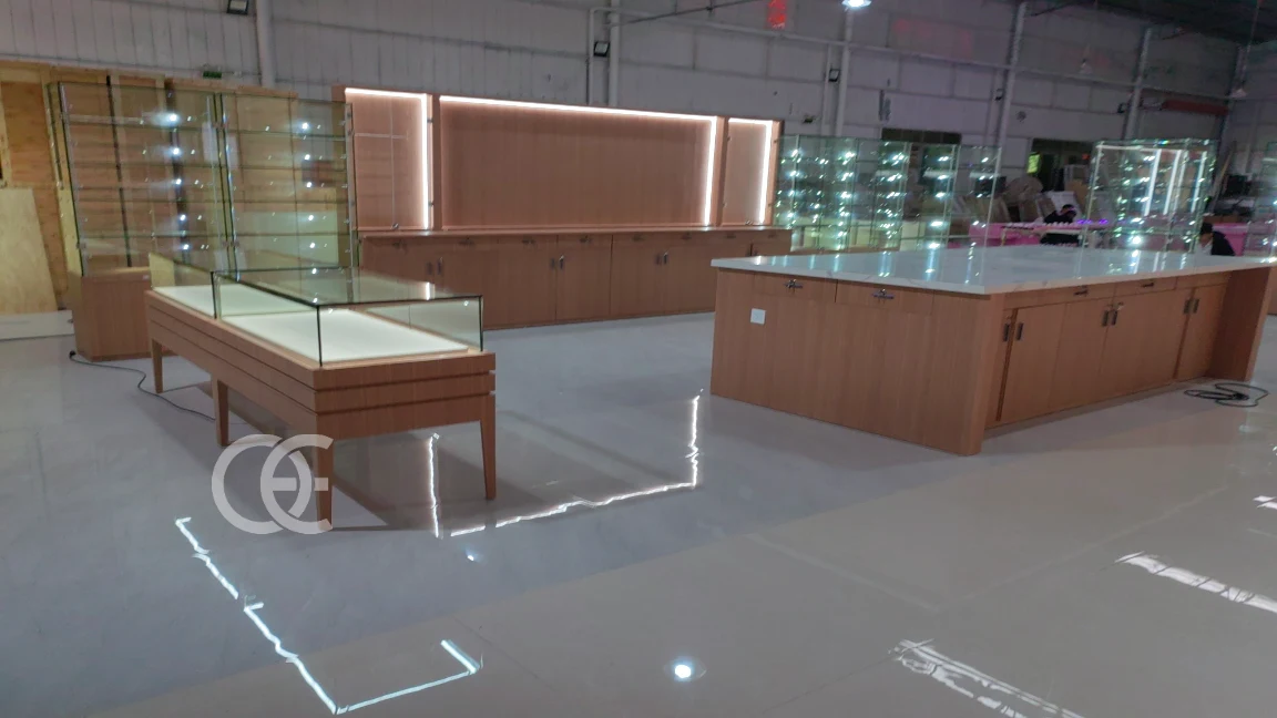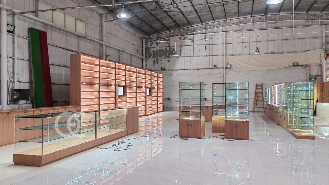 Ouyee bietet Großhandels-Smoke-Shop-Vitrinen entwickelt für moderne Tabak-, CBD- und Vape-Einzelhandelsumgebungen. Dieses elegante Setup verbindet natürliche Holzoberflächen mit vollverglasten Türmen und schafft ein helles, offenes Einzelhandelslayout, das Produkte mit perfekter Sichtbarkeit hervorhebt.