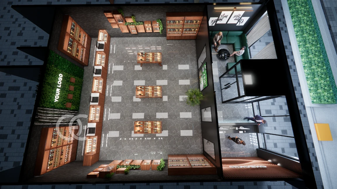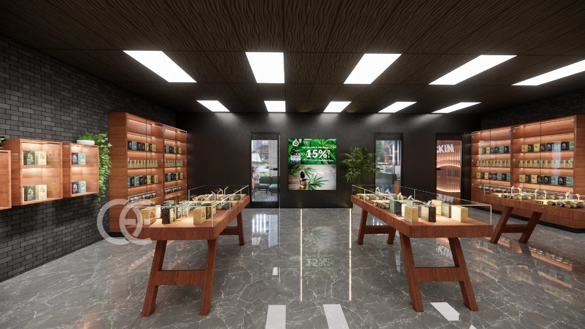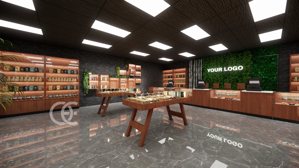 Cannabis Dispensary Displays Tobacco Fixtures by Ouyee blend warm wood cabinets, glass-front counters, and a living-wall logo backdrop for a refined, nature-meets-modern retail read.
