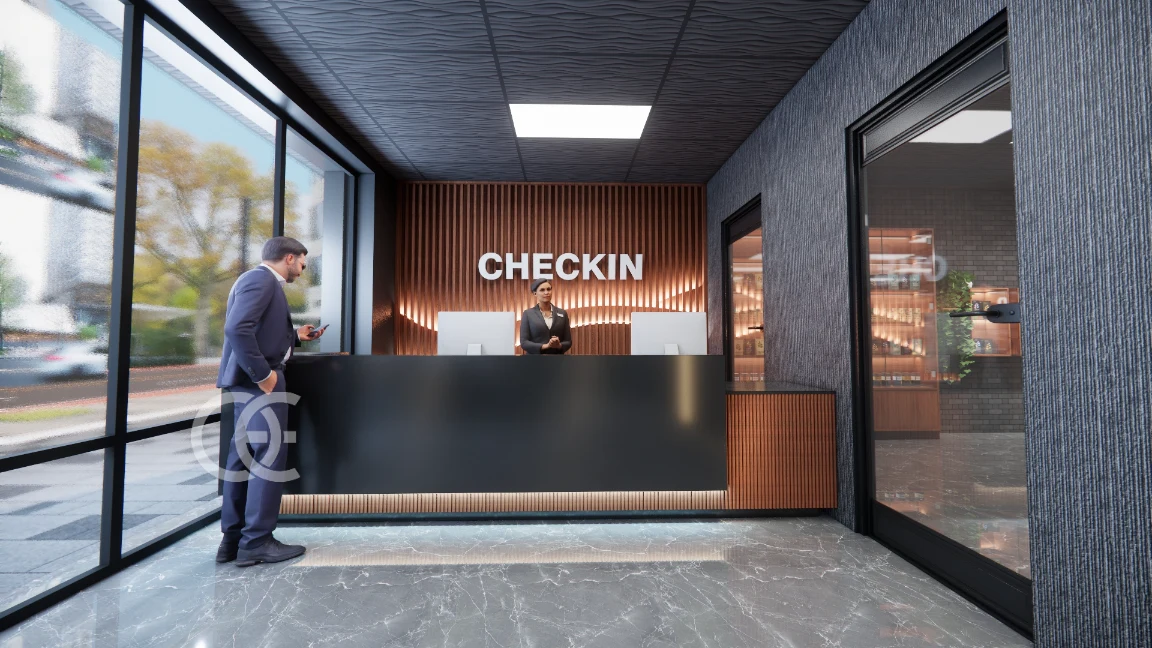 The dark brick backdrop boosts contrast, the green wall softens the space, and the marble-look floor reflects light for crisp label readability and clean queue flow.