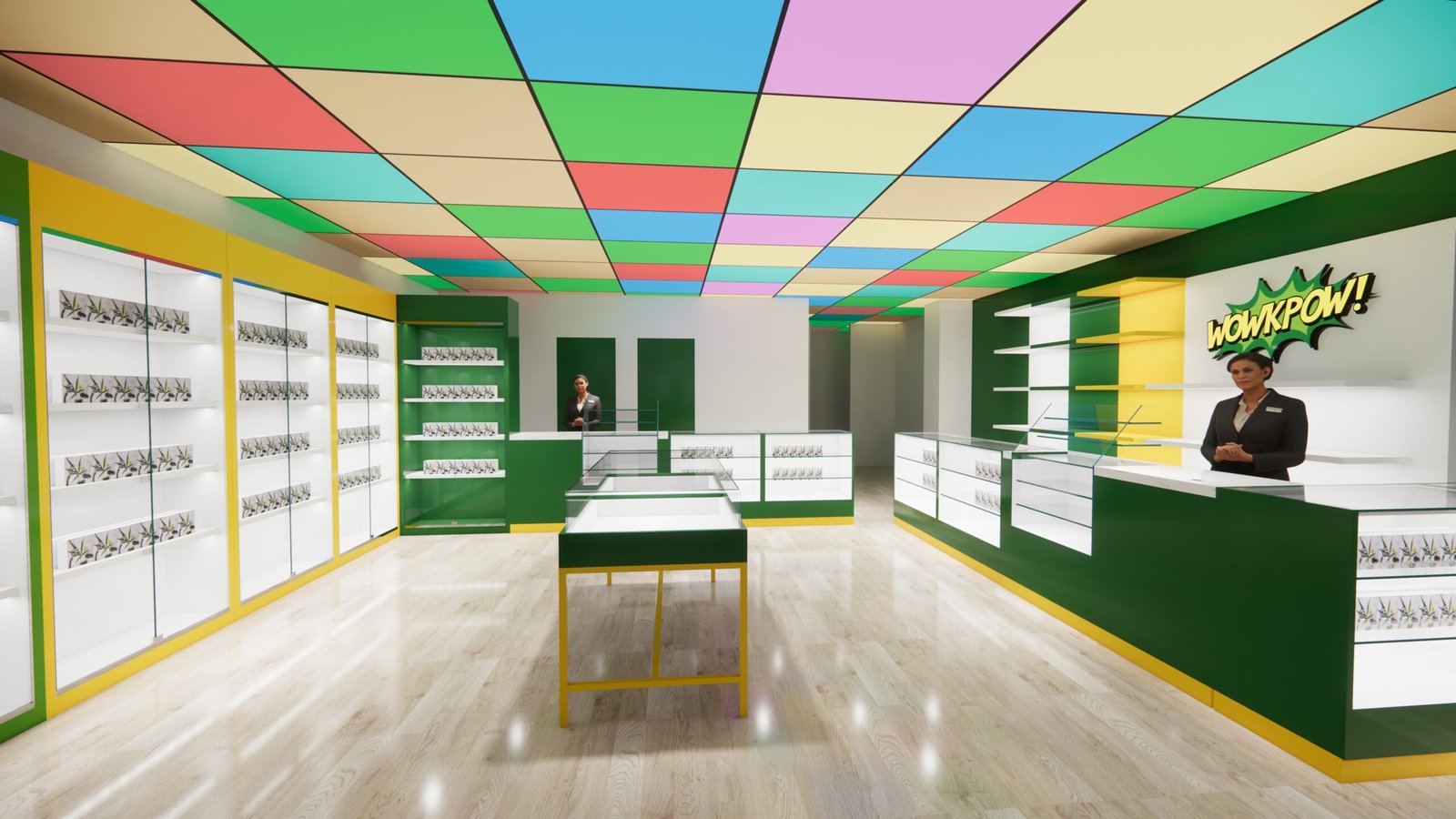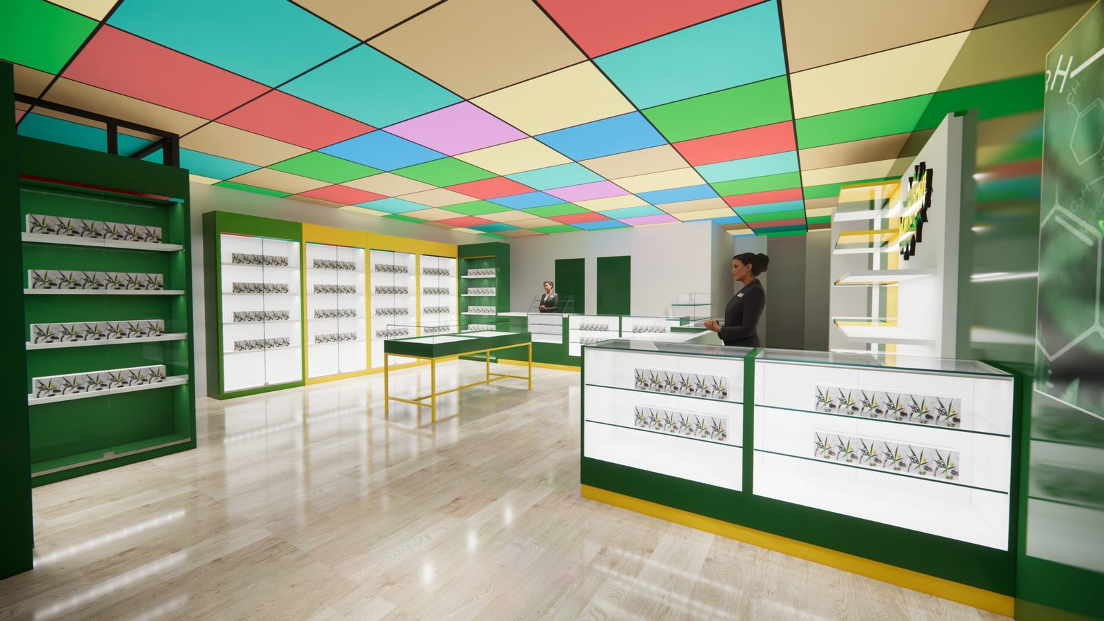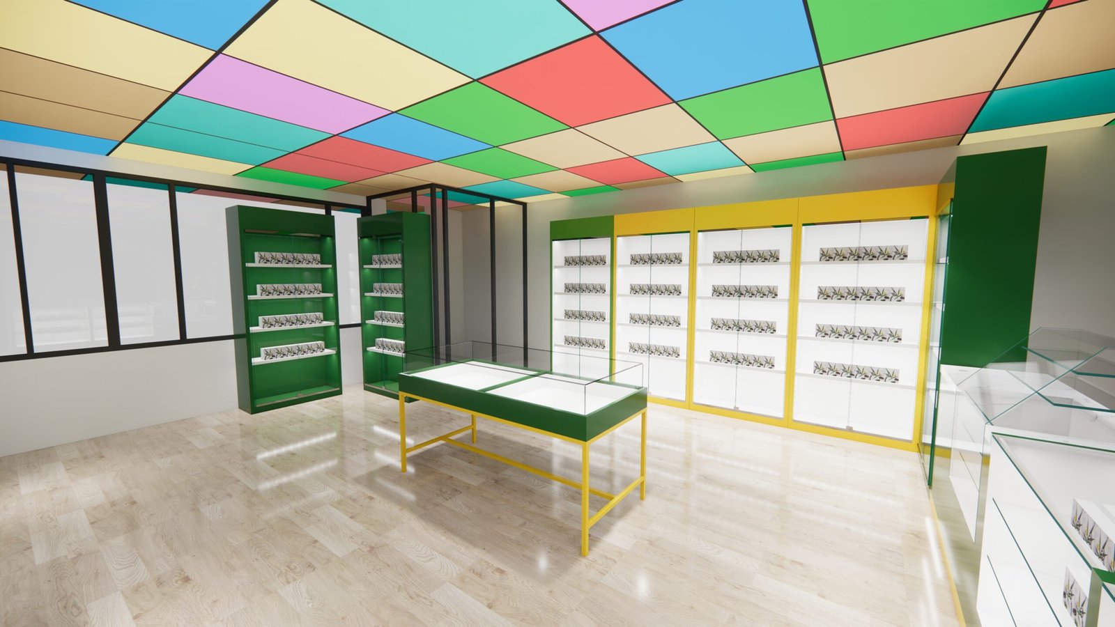 Cannabis dispensary store displays by Ouyee pair color-blocked branding with clean, backlit merchandising. Green-and-yellow frames, glass counters, and illuminated wall bays turn SKUs into a bright, easy-to-shop layout.
