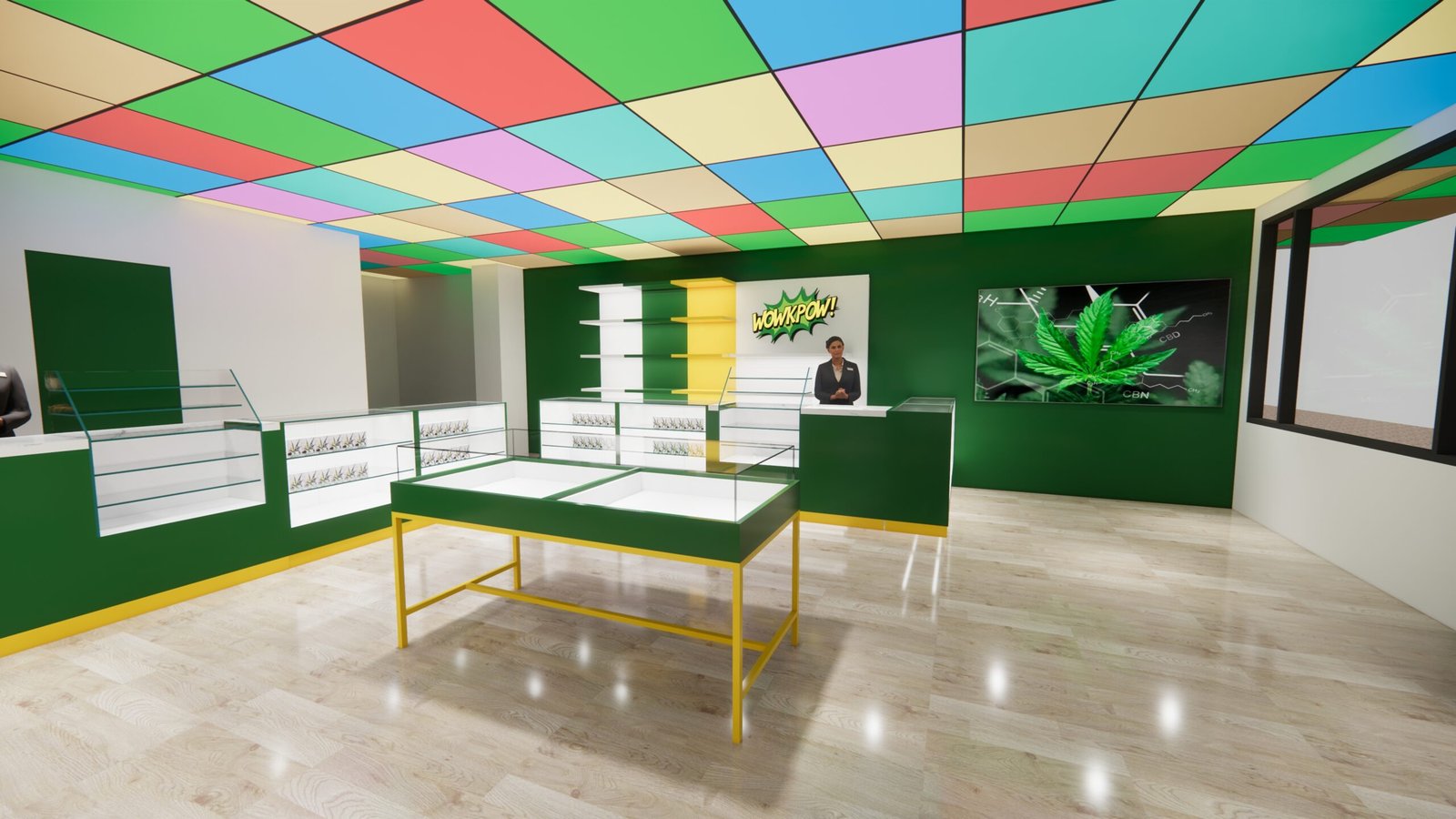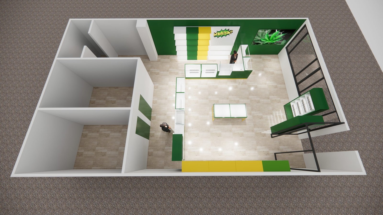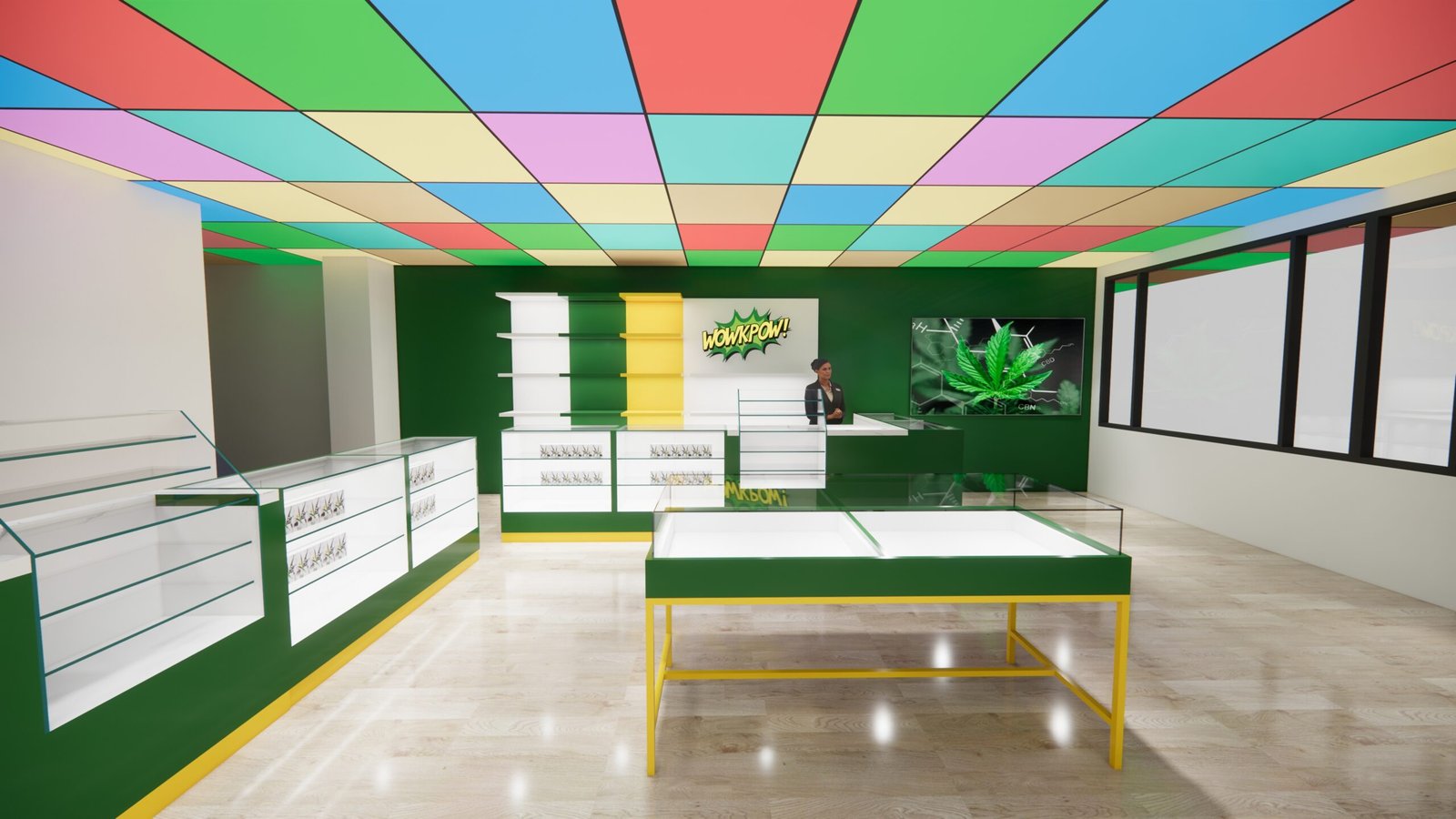 Cannabis dispensary store displays by Ouyee pair color-blocked branding with clean, backlit merchandising. Green-and-yellow frames, glass counters, and illuminated wall bays turn SKUs into a bright, easy-to-shop layout.