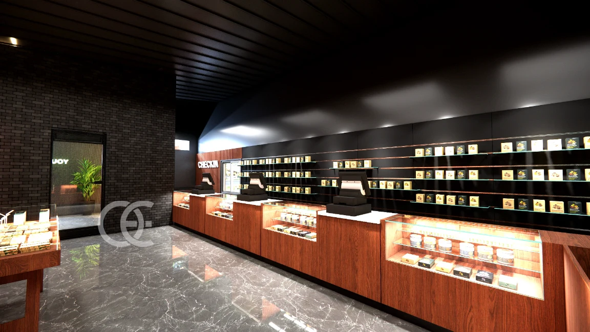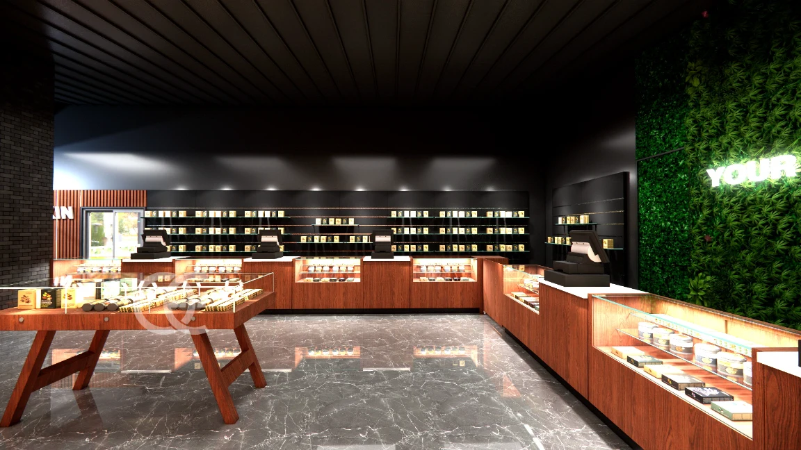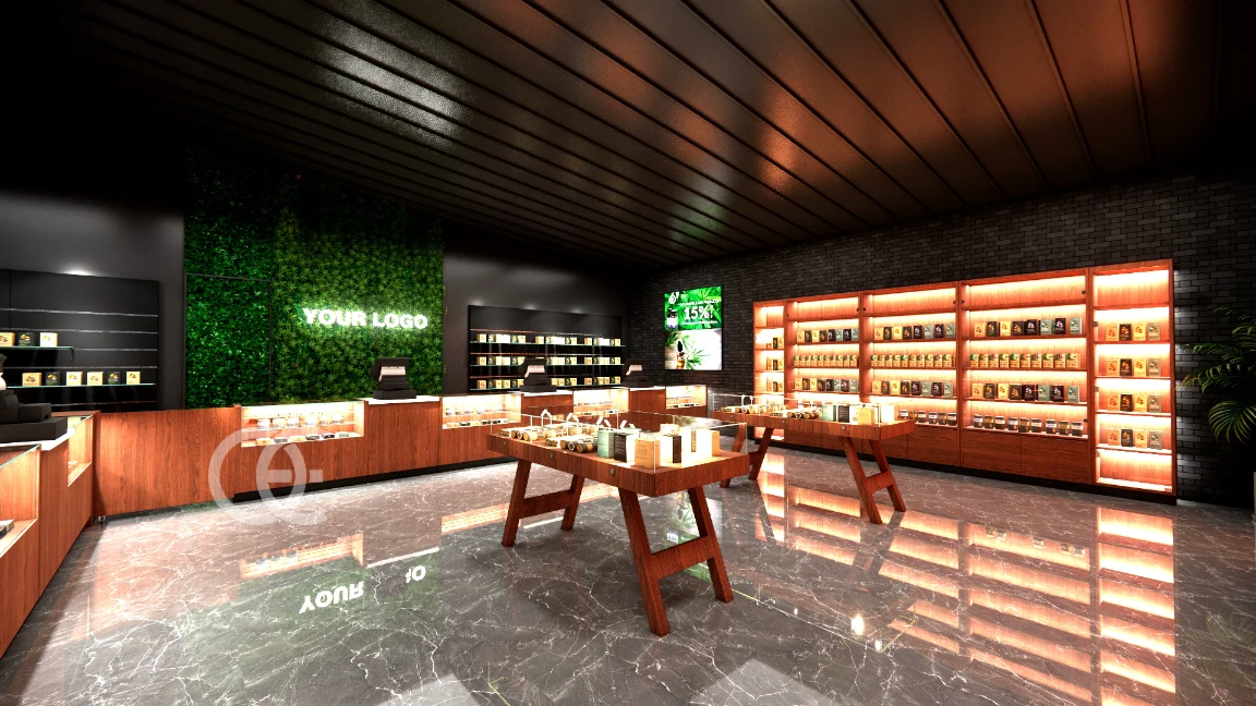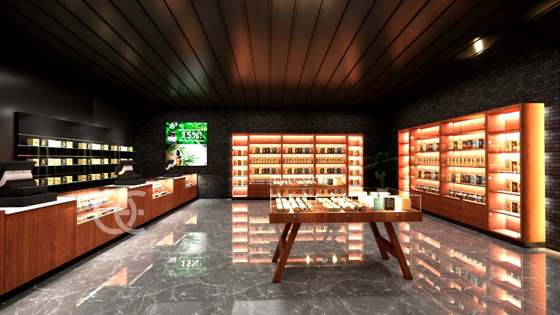 Cannabis store design and fixtures by Ouyee create a warm, premium shopping flow with backlit wall bays, feature tables, and efficient POS counters. Retail-ready layouts balance brand storytelling with compliant, secure merchandising.