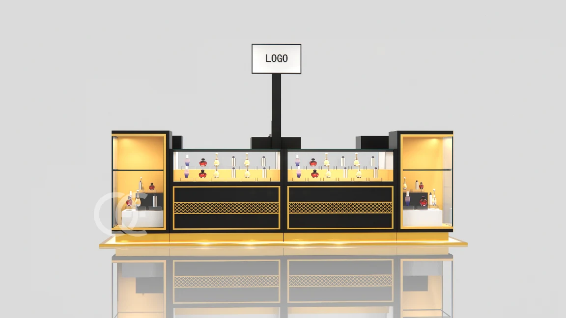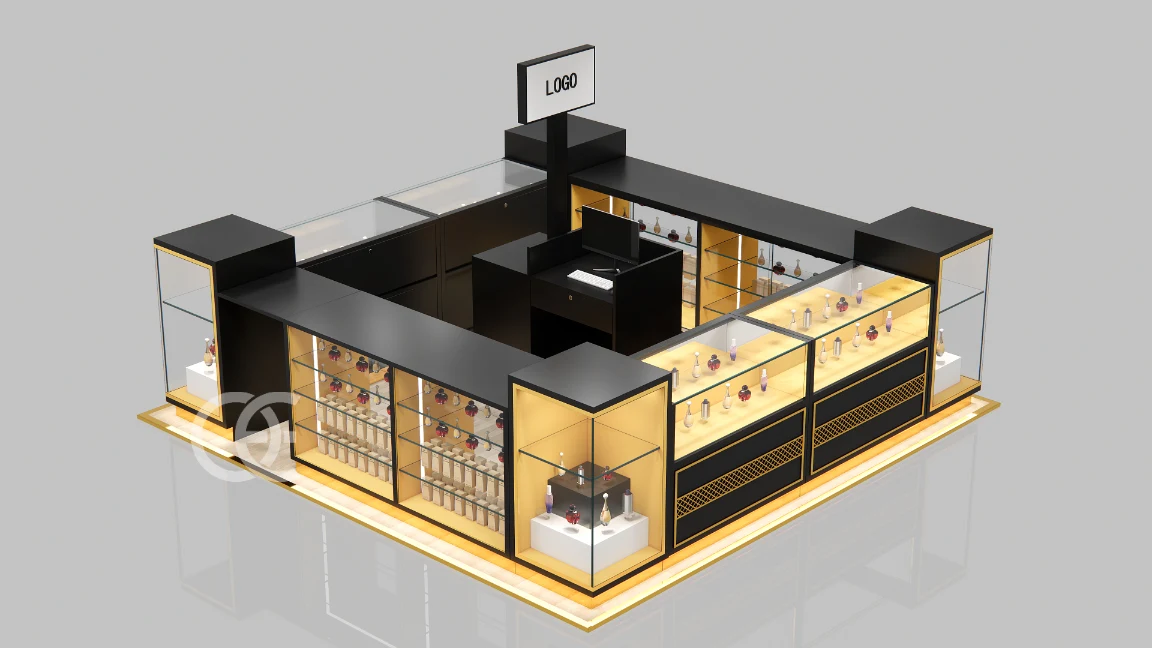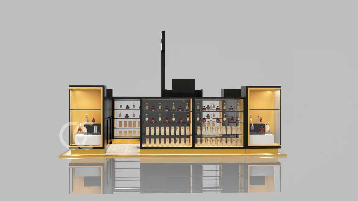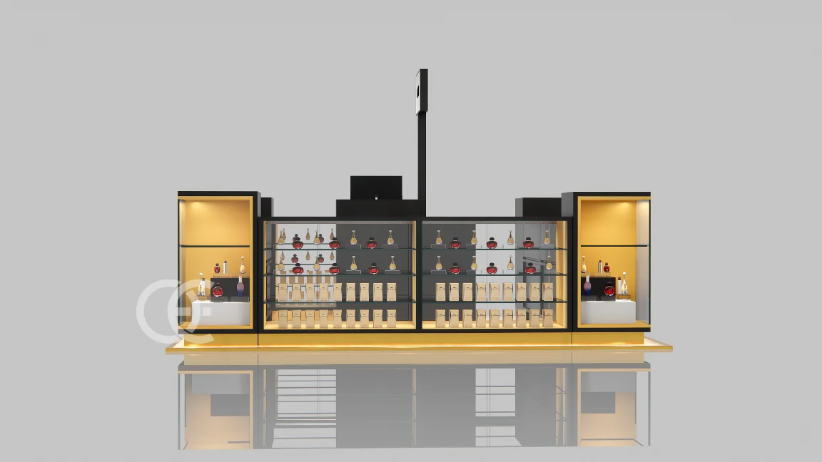 perfume display showcases by Ouyee spotlight hero SKUs. Retail‑ready: low‑iron glass, secure locks, cable‑managed power.