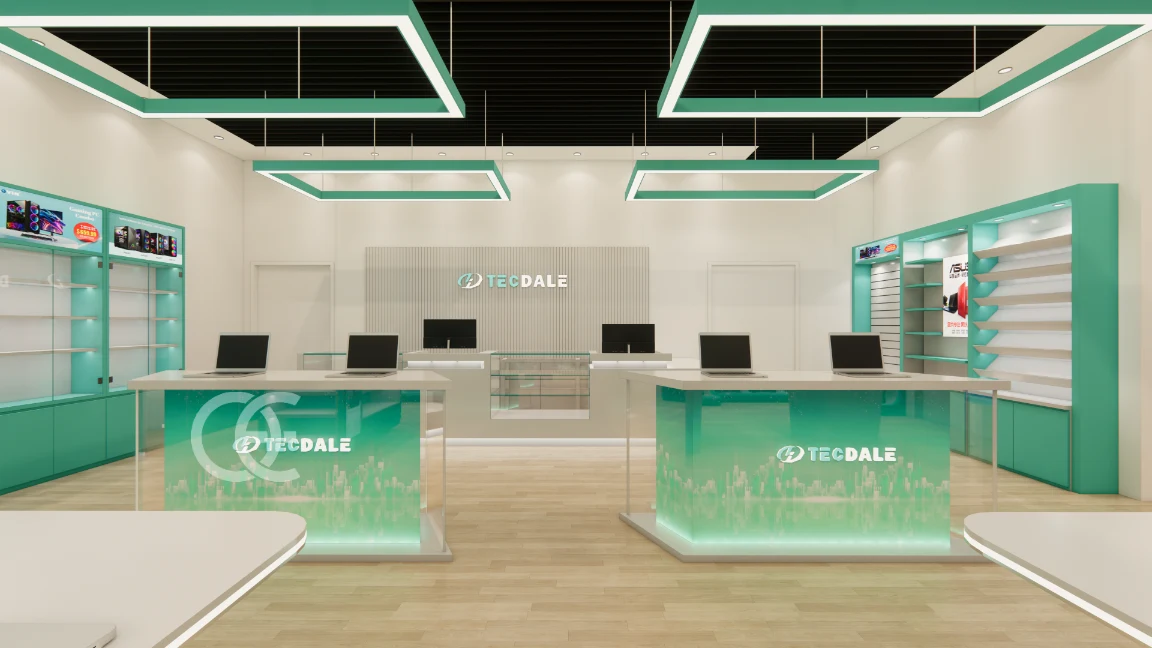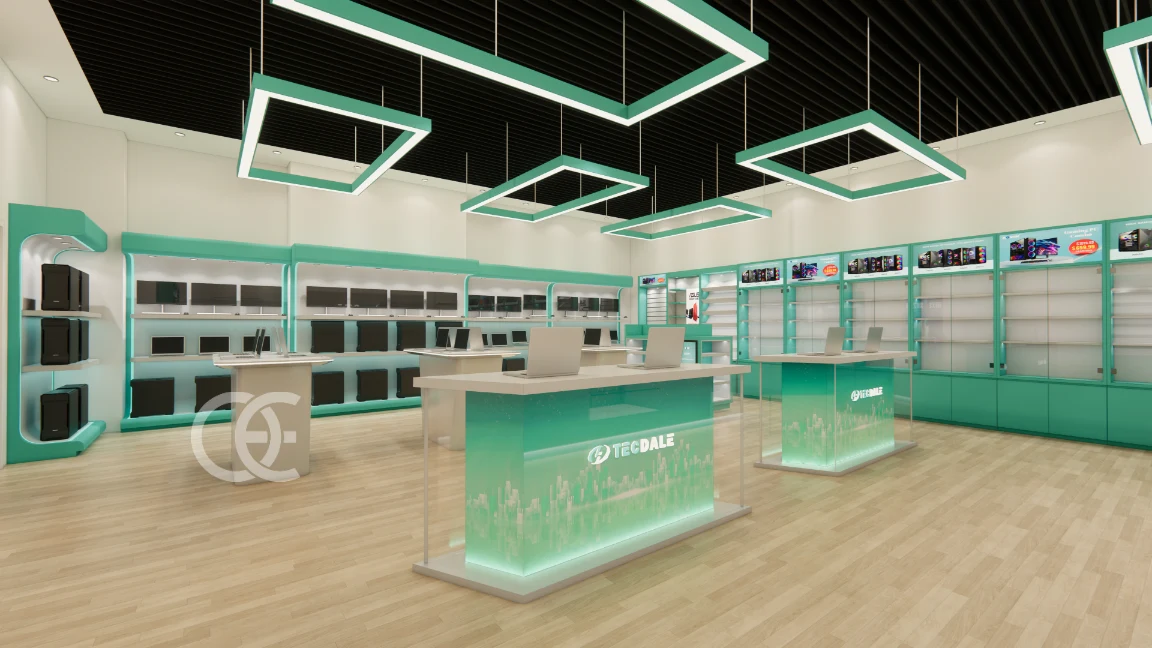 ✅ Center demo islands with frosted acrylic bases and soft under-glow to spotlight devices.