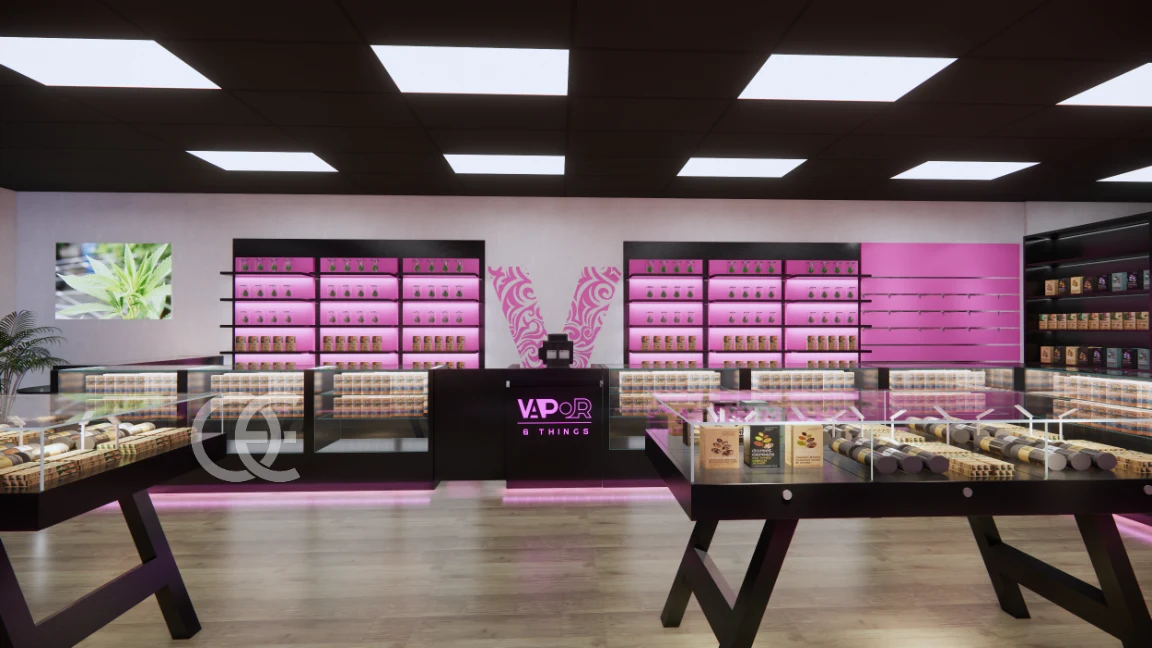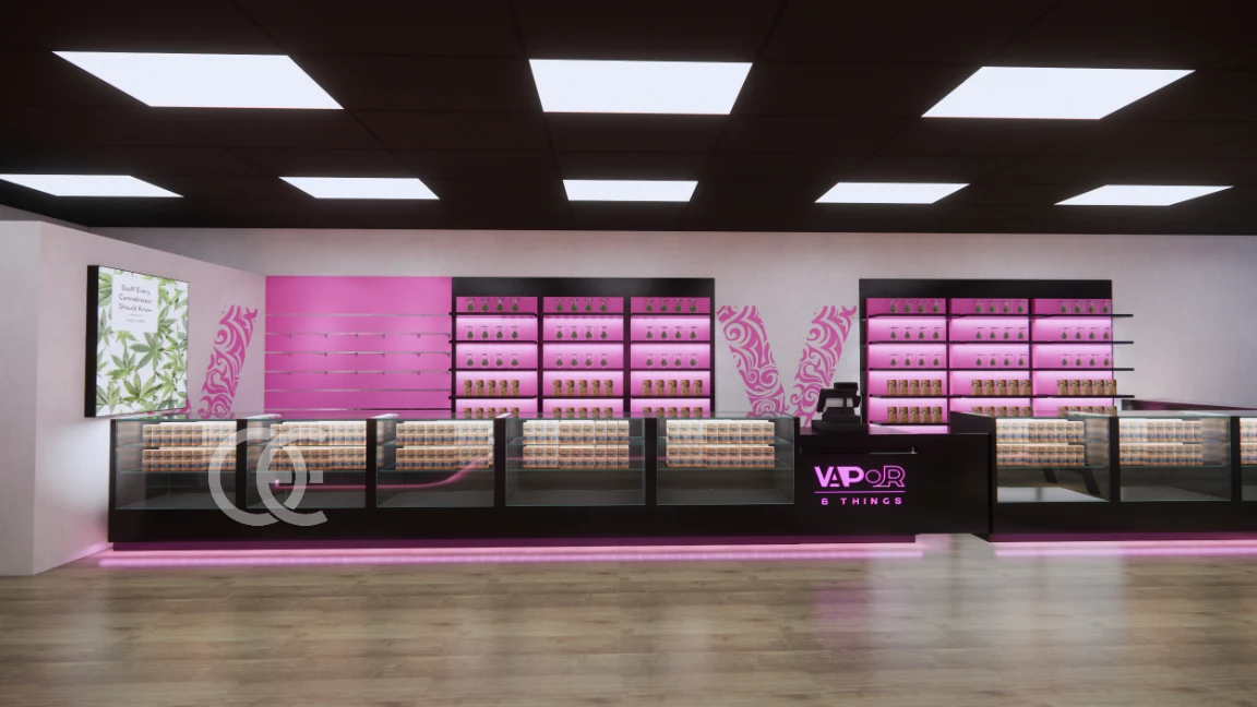E-Cigarette Display Case | Glass Showcases by Ouyee pairs long black counters with magenta under-glow and backlit wall bays for a vivid, high-contrast retail line. Clear, lockable glass keeps pods, disposables, and kits secure and easy to browse.