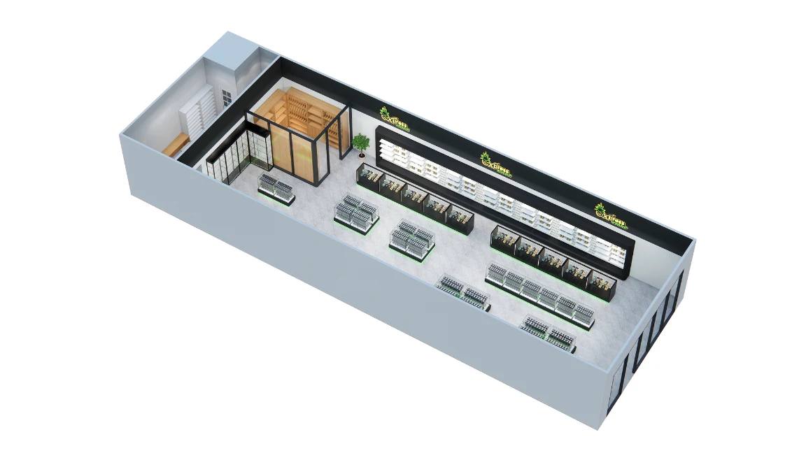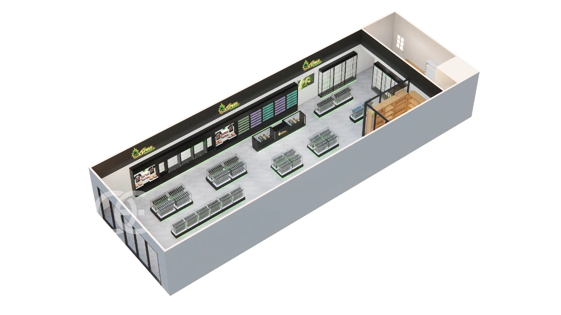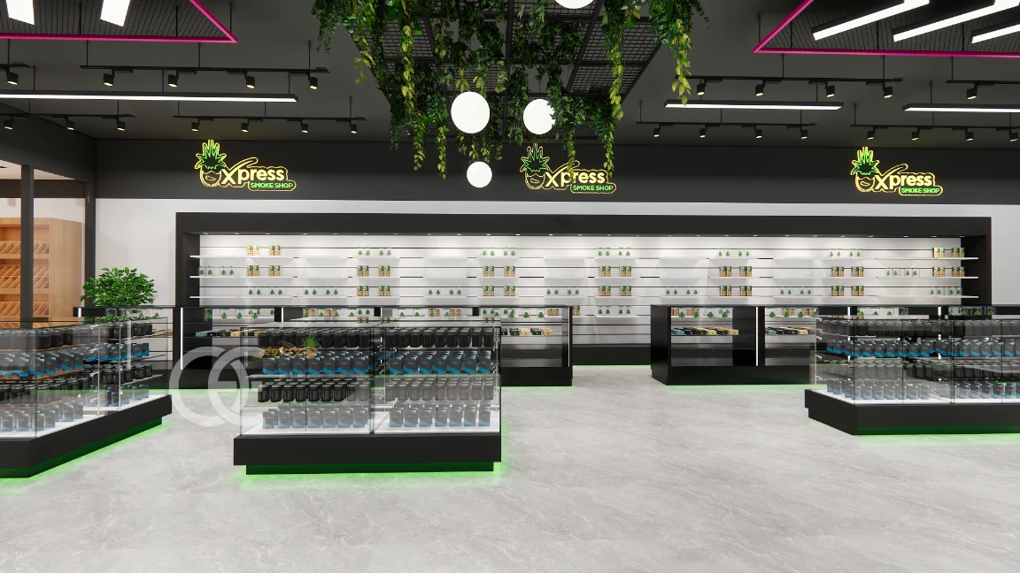 Geometric ceiling frames and hanging greenery add depth while the backlit wall keeps labels readable from the aisle. The system separates devices, tobacco, and accessories so staff serve faster with clear sightlines and compliant control.