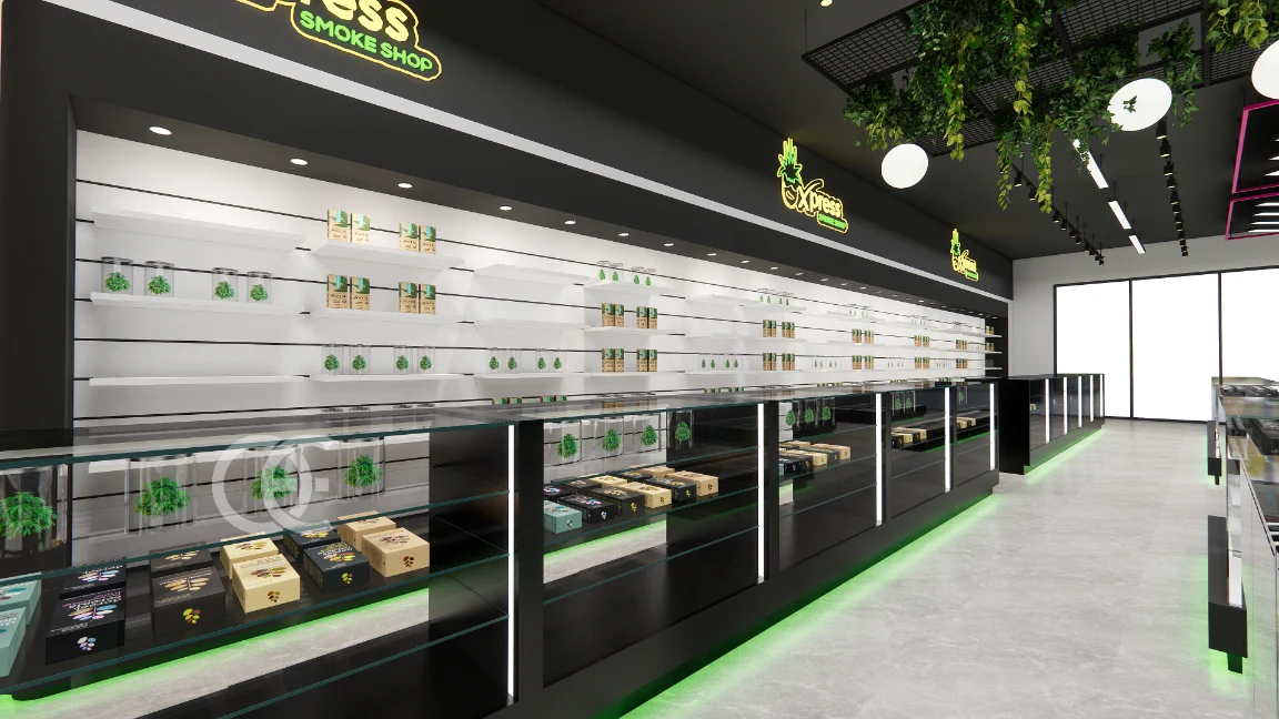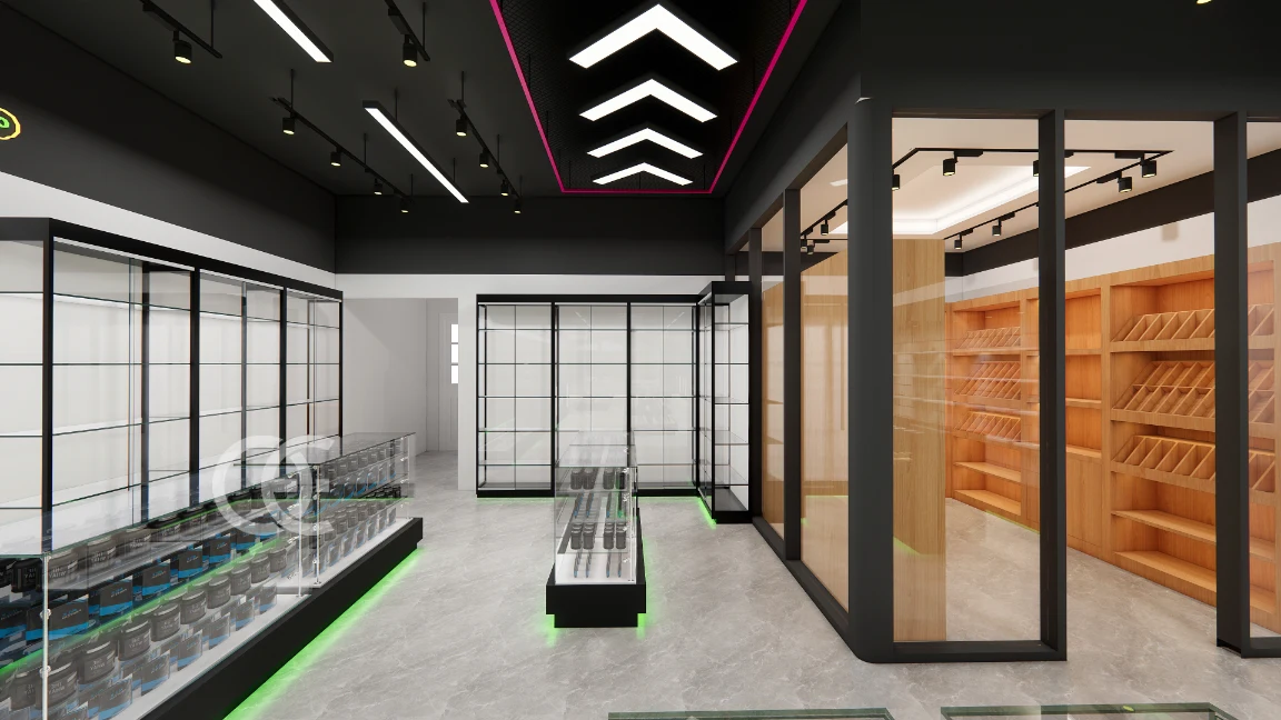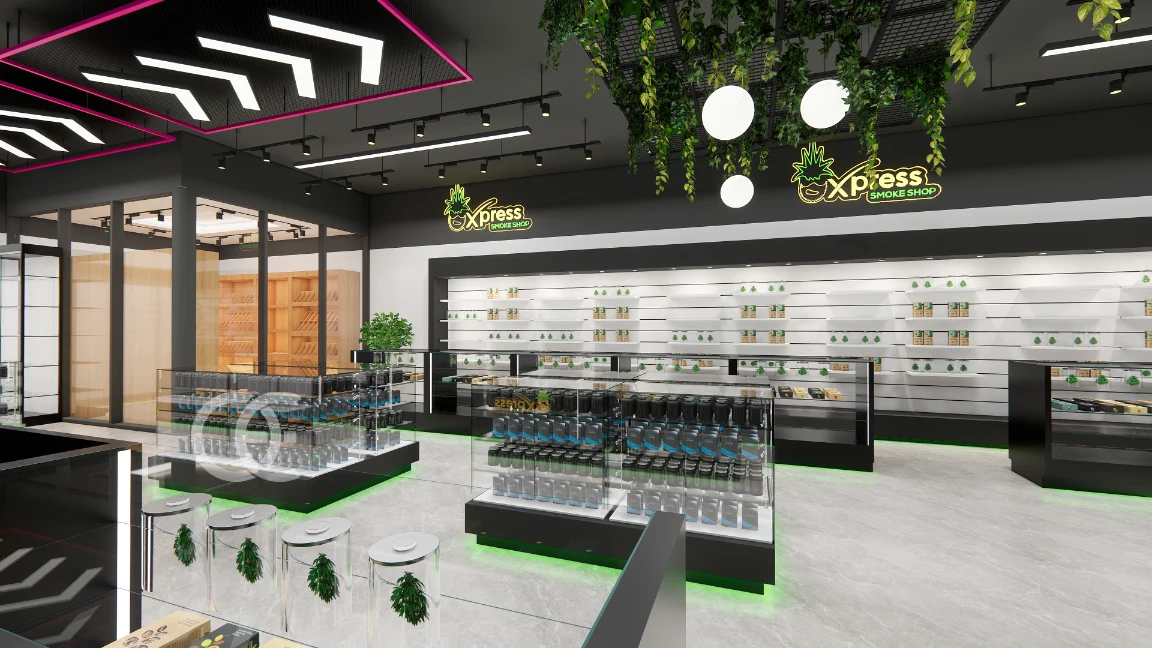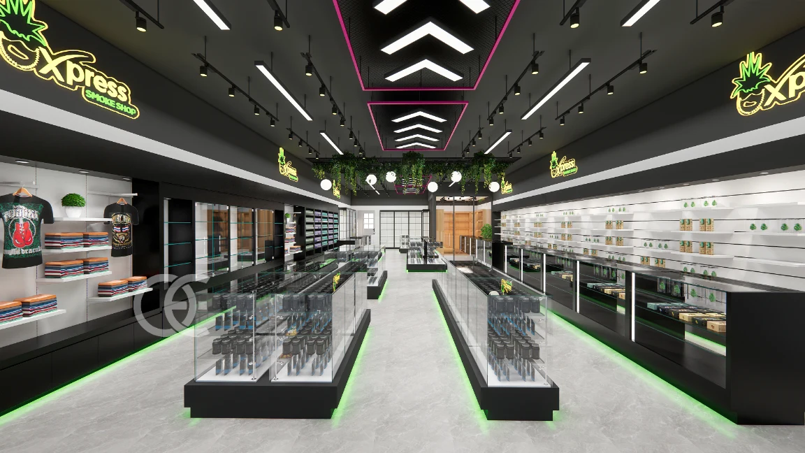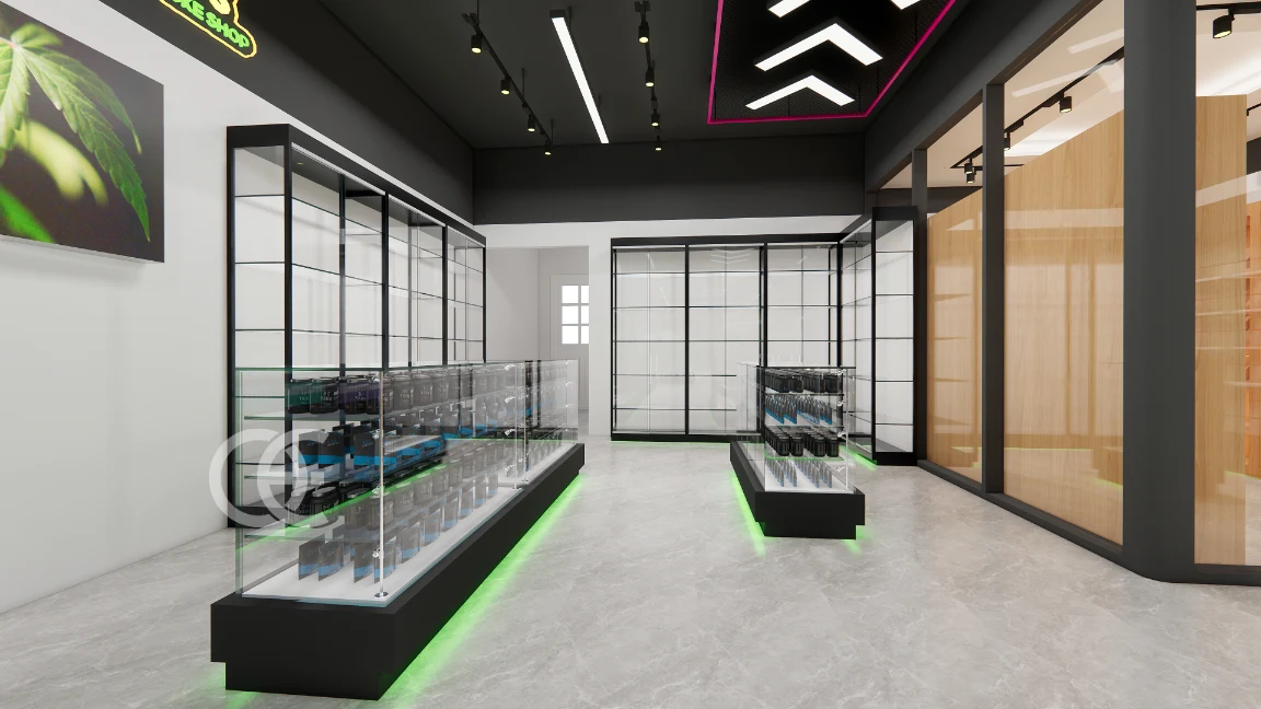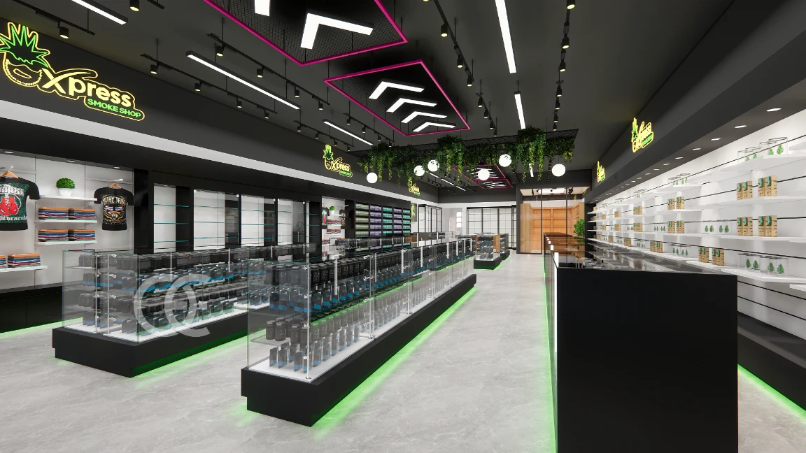 ✅ Long glass counters with vertical light strips highlight pipes, grinders, and premium tobacco sets.