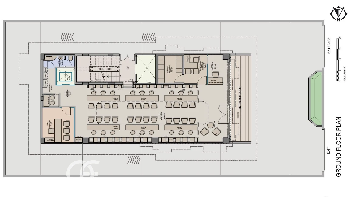 2. Floor plan with traffic flow, key elevations/details, lighting and power layout