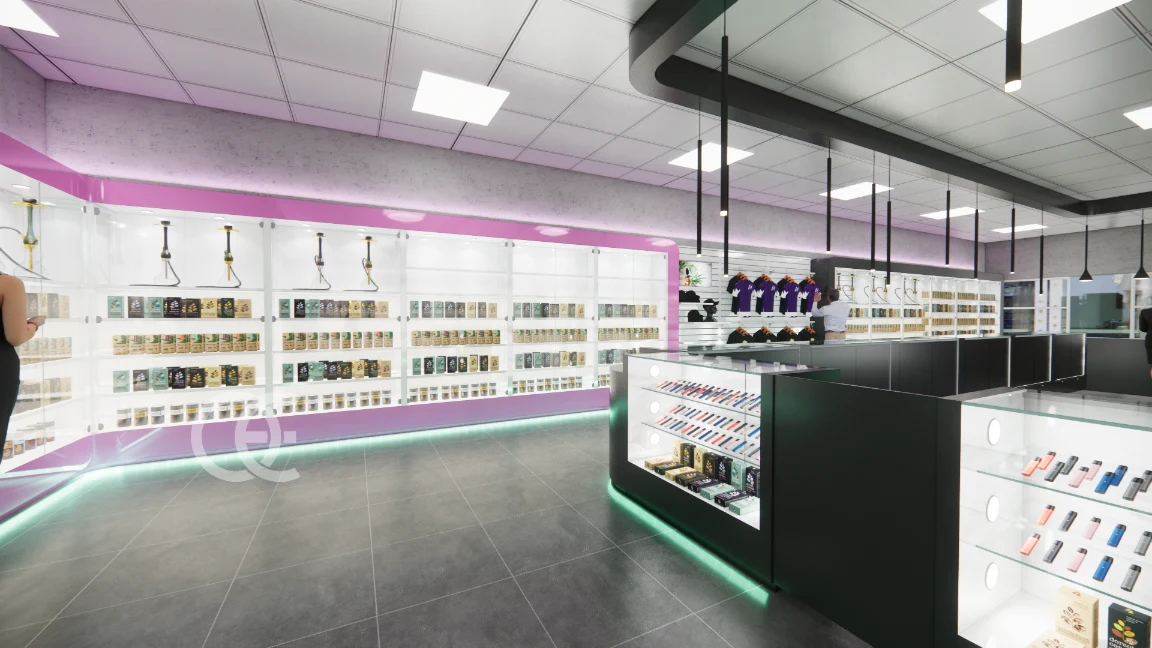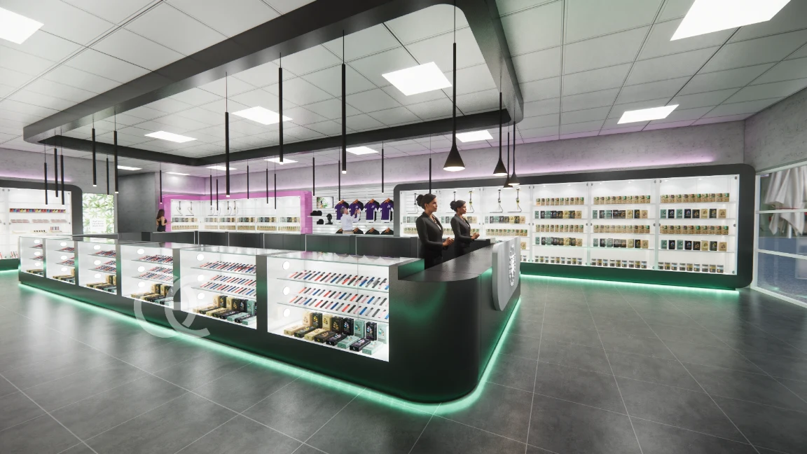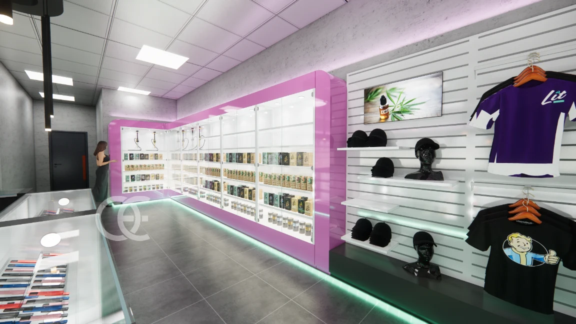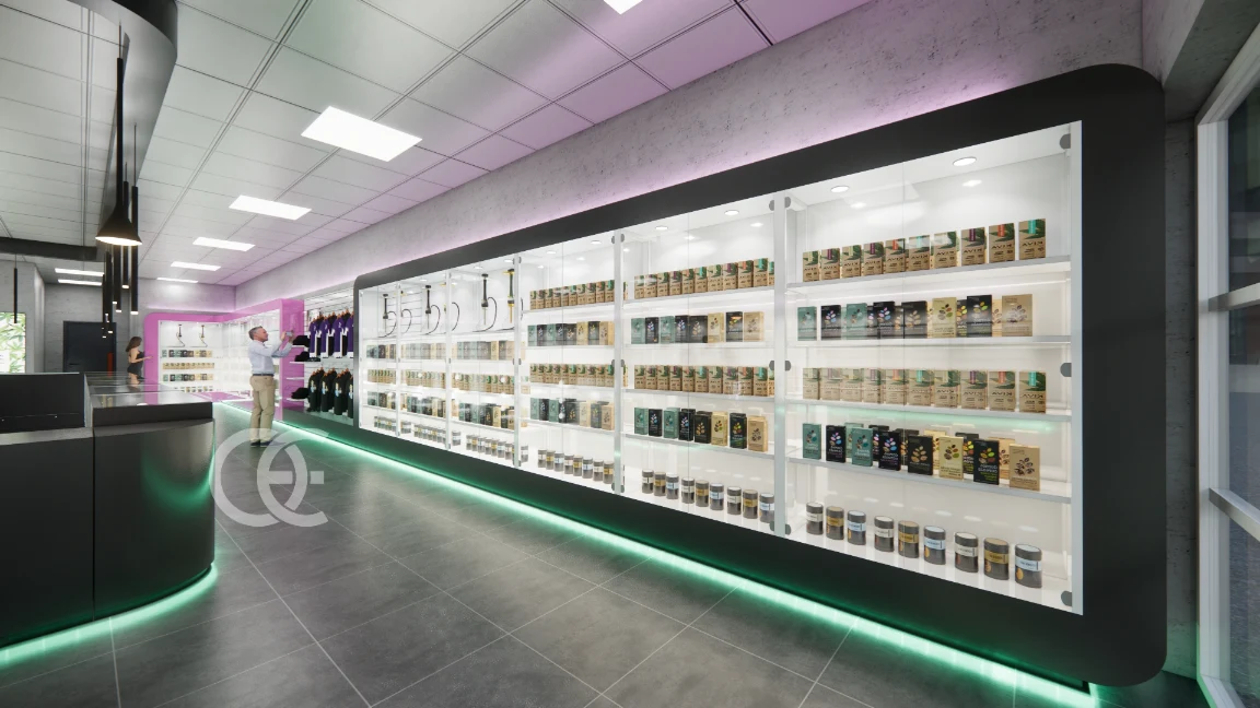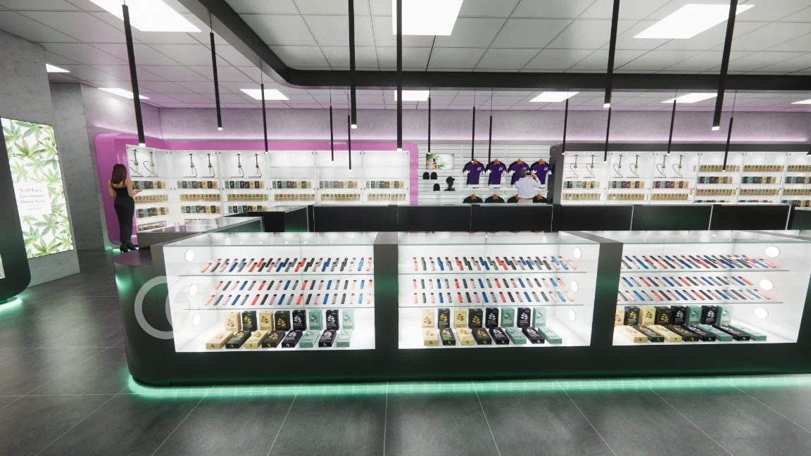 The layout supports fast browsing across flower, vapes, and edibles while apparel racks live on the slatwall. Pendant task lighting and reflective floors keep labels legible and the space airy.