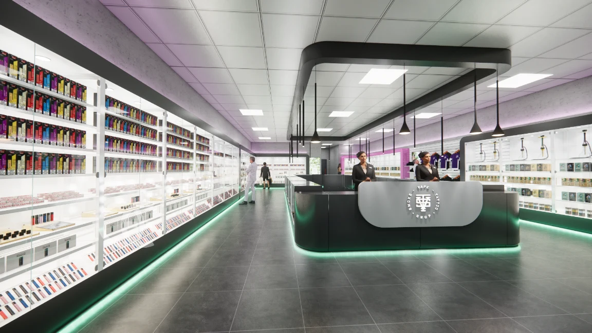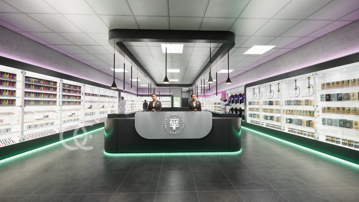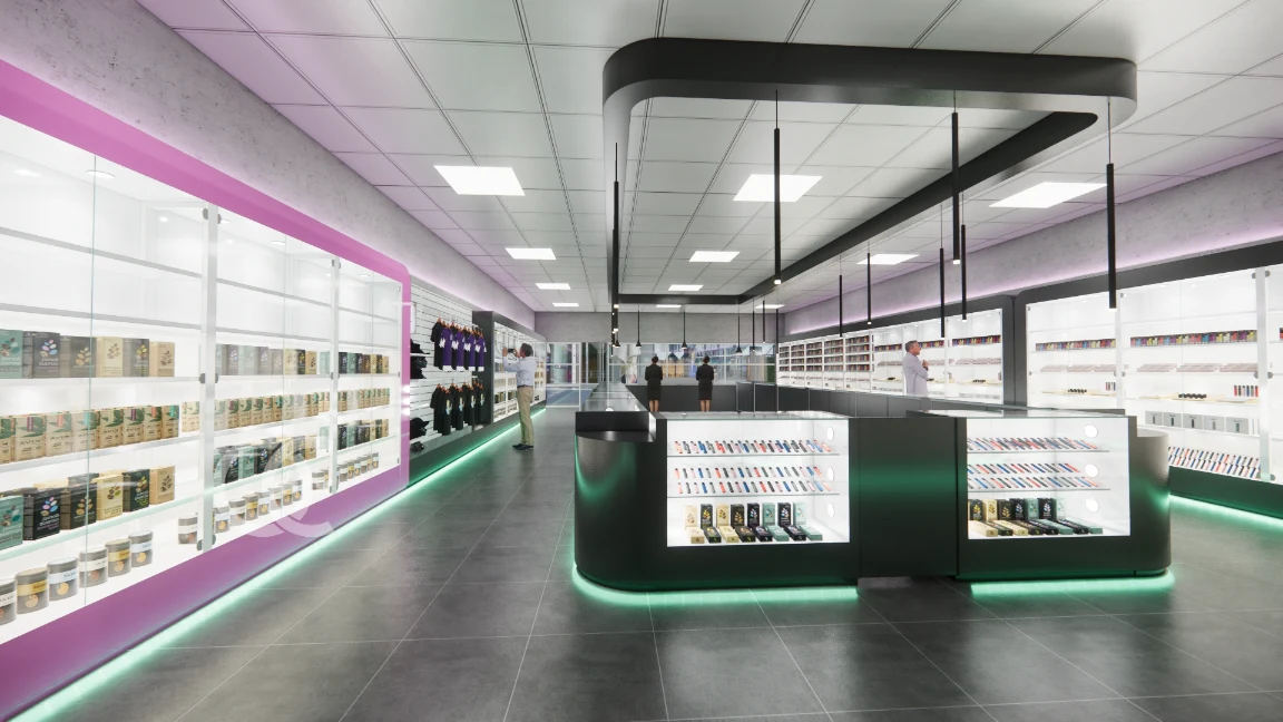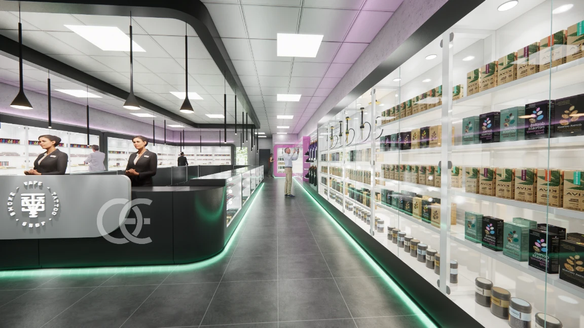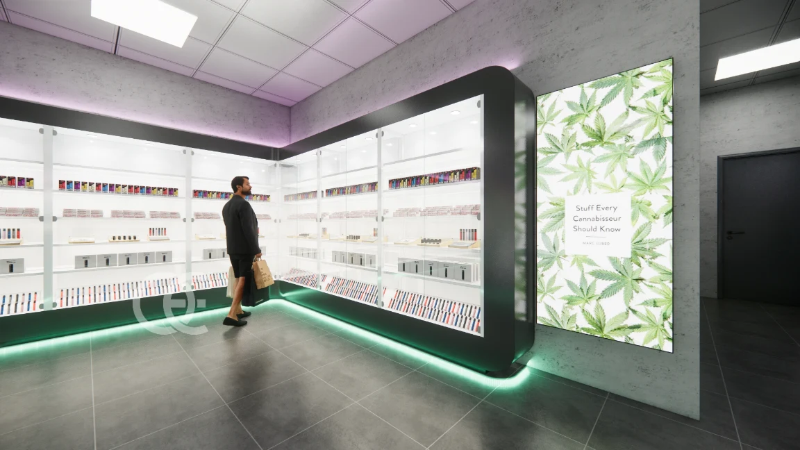 The layout supports fast browsing across flower, vapes, and edibles while apparel racks live on the slatwall. Pendant task lighting and reflective floors keep labels legible and the space airy.