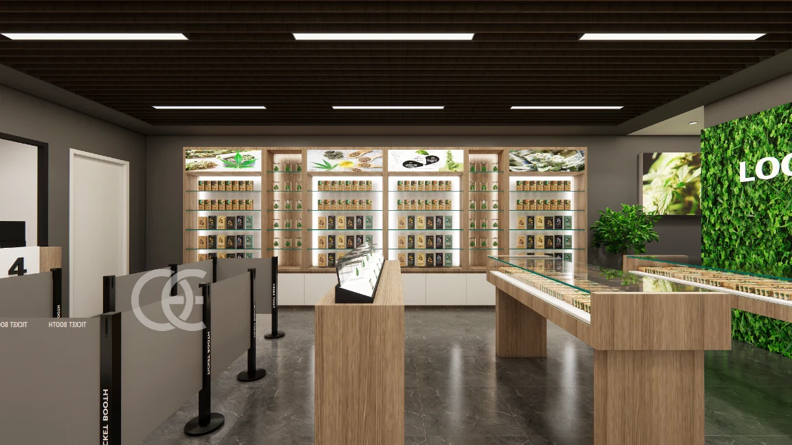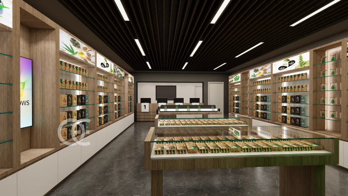 ✅ Backlit wall displays with tempered glass shelves and lightbox headers for flower, prerolls, vapes, and edibles.