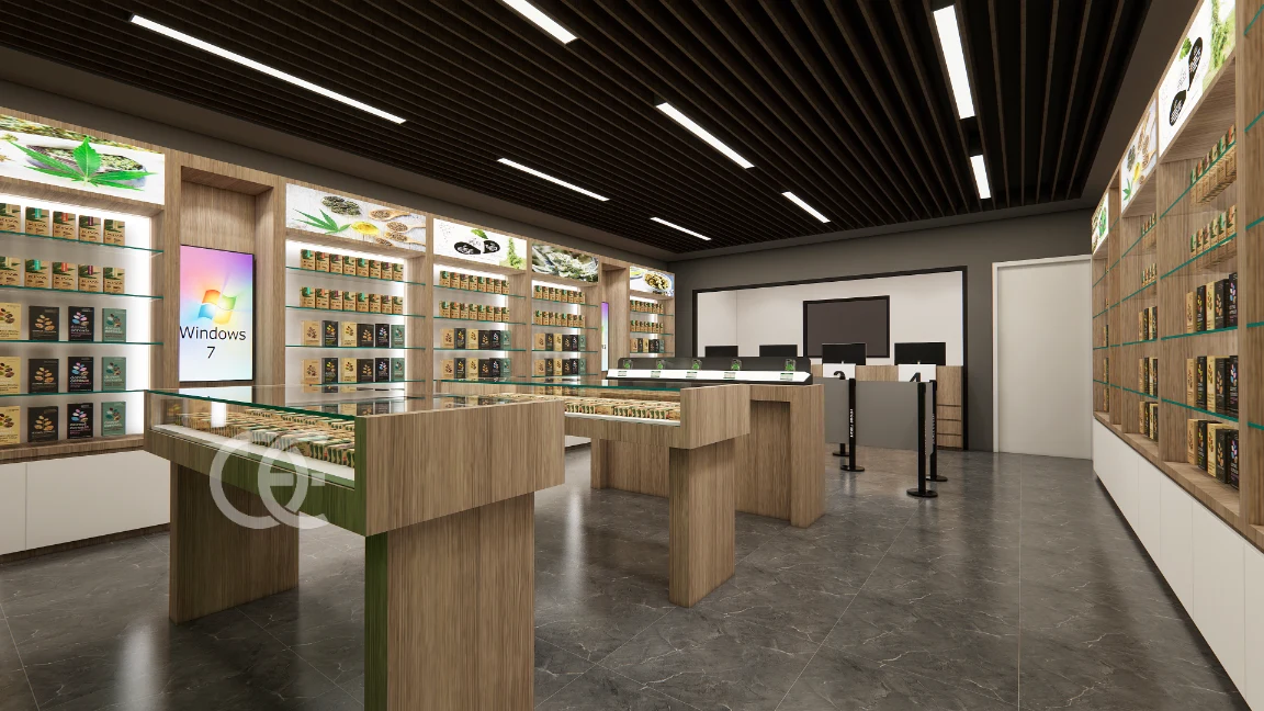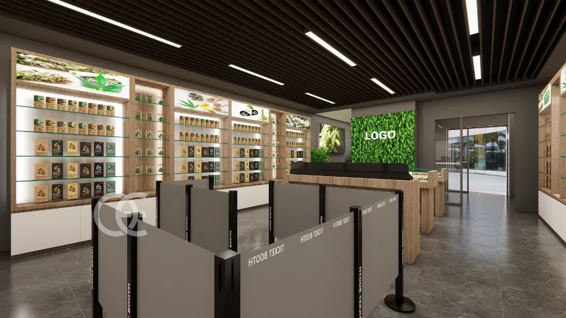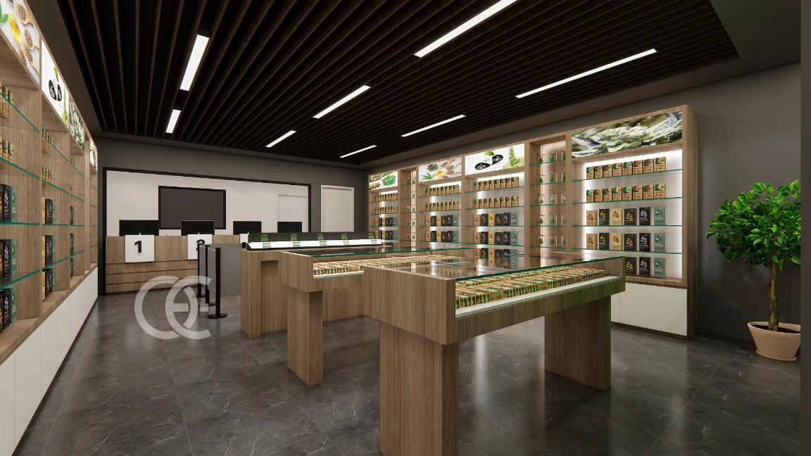 Retail Display Modular Dispensary Fixtures by Ouyee use warm wood veneers, glass-shelf wall bays, and island vitrines to create a calm, gallery-like shopping flow. Backlit header panels with botanical graphics keep labels legible while guiding categories.