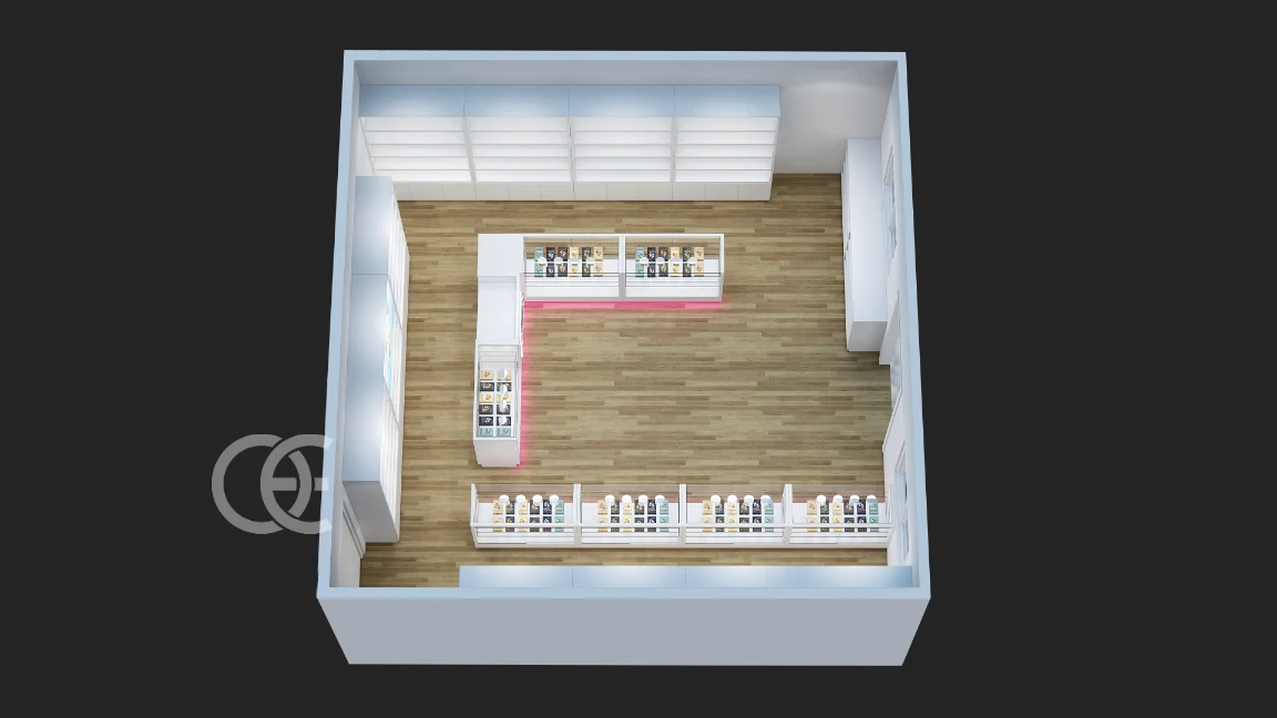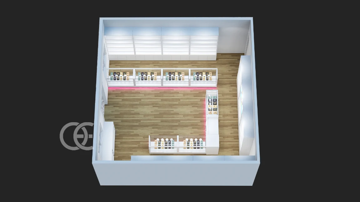 Designed around clear sightlines and quick comparison shopping, this showcase layout keeps best-sellers at hand while the illuminated base guides customers down the central aisle. The white palette and glass shelving amplify light, making small SKUs look organized and premium.