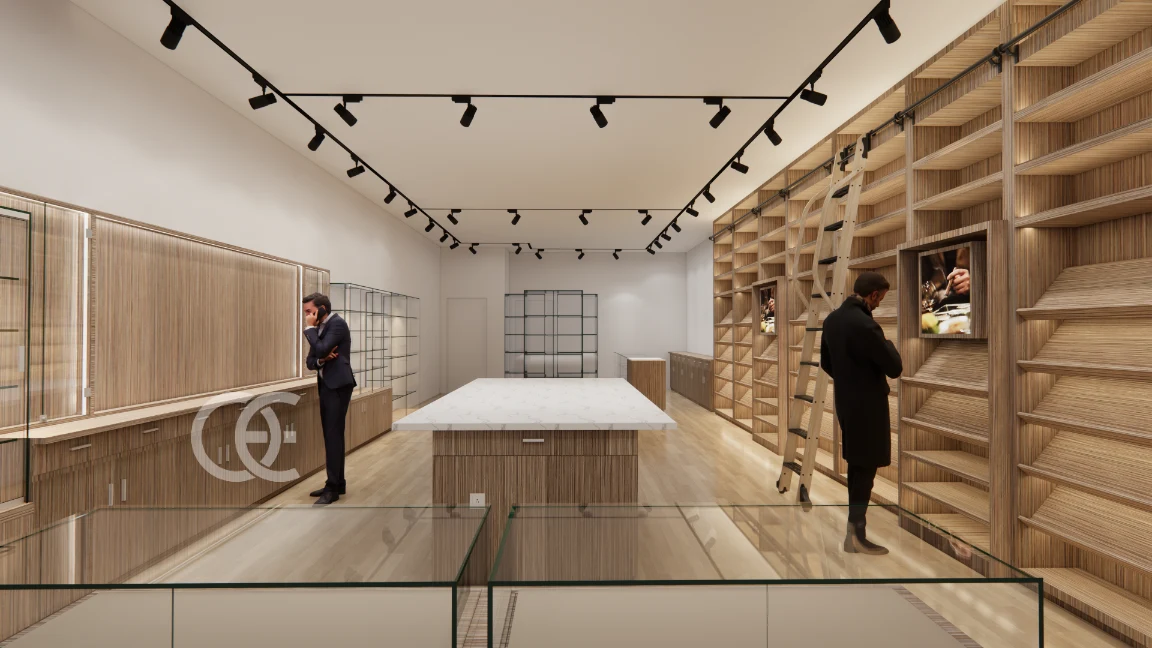 The library vibe boosts perceived value while clear sightlines keep service efficient. Use the tall wall for bulk SKUs and the vitrines for premium pieces, then rotate curated sets on the island to drive discovery and upsell.