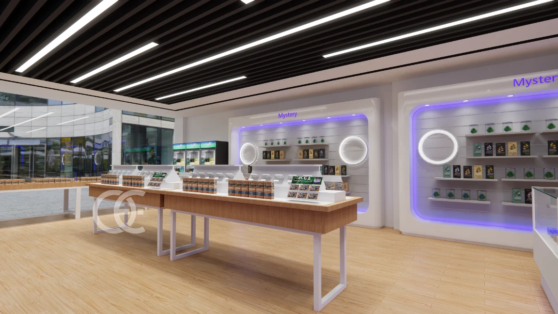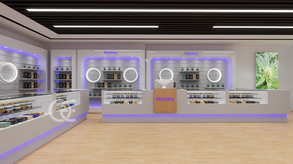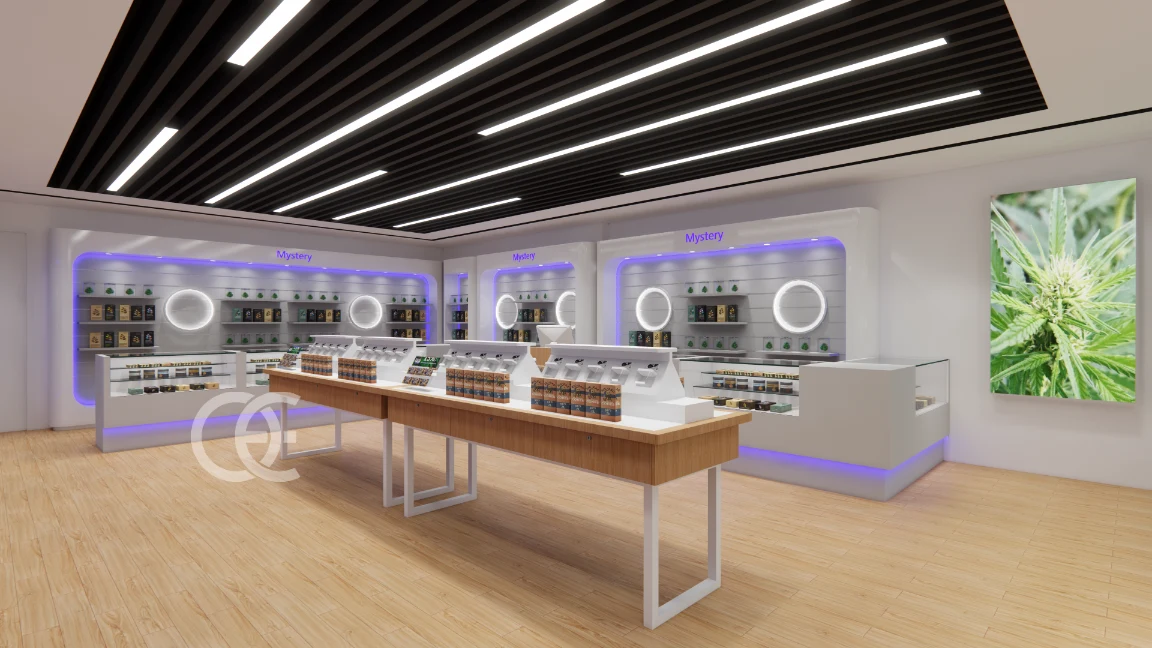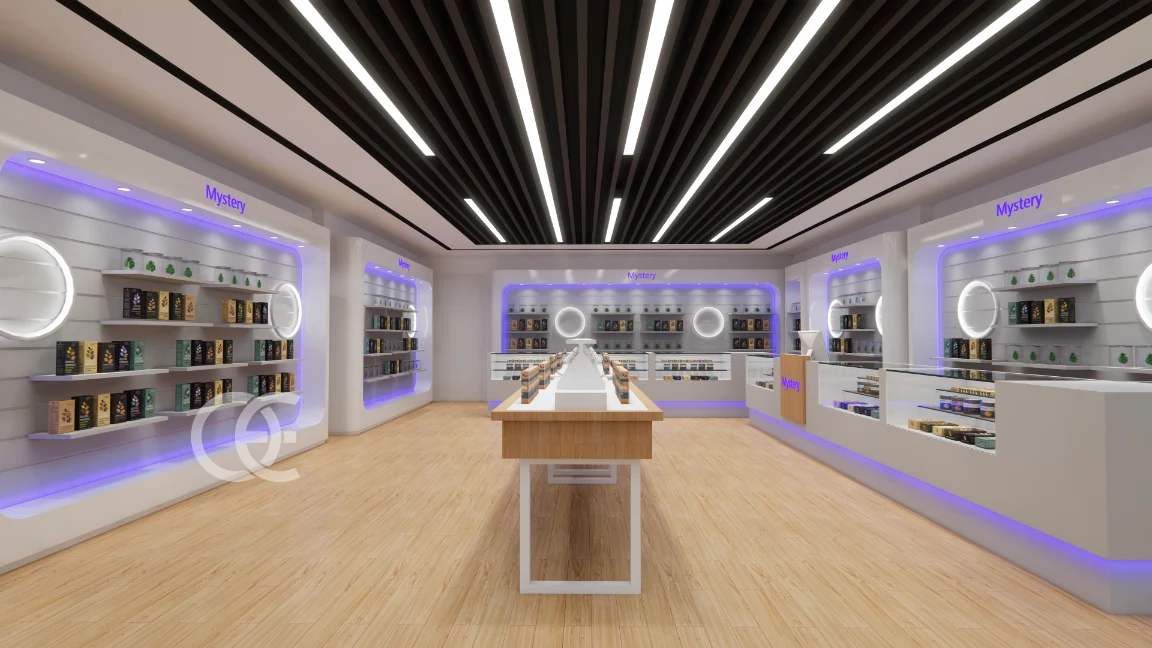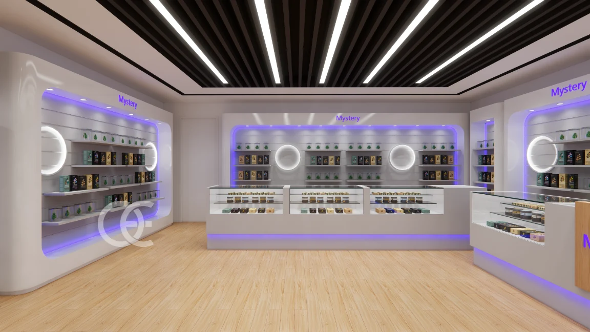 Ouyee’s dispensary fixtures are engineered for daily retail: metal sub-frames for durability, scratch-resistant finishes, and ventilation where lighting or electronics are housed. The rounded display niches and ring lights create a soft, futuristic vibe that fits vape shops, cannabis dispensaries, and CBD boutiques.