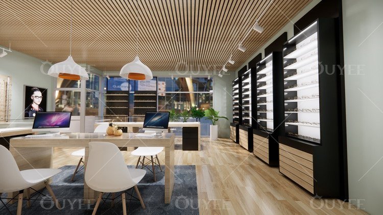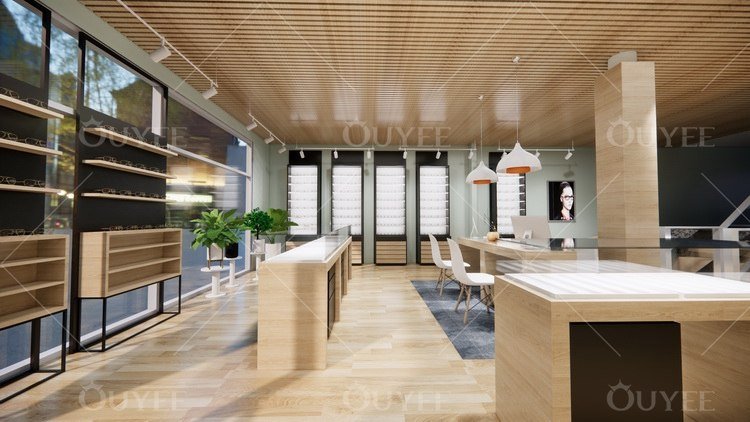 Ouyee offre una soluzione completa per la progettazione di negozi di occhiali che include pianificazione degli interni e vetrine personalizzate.