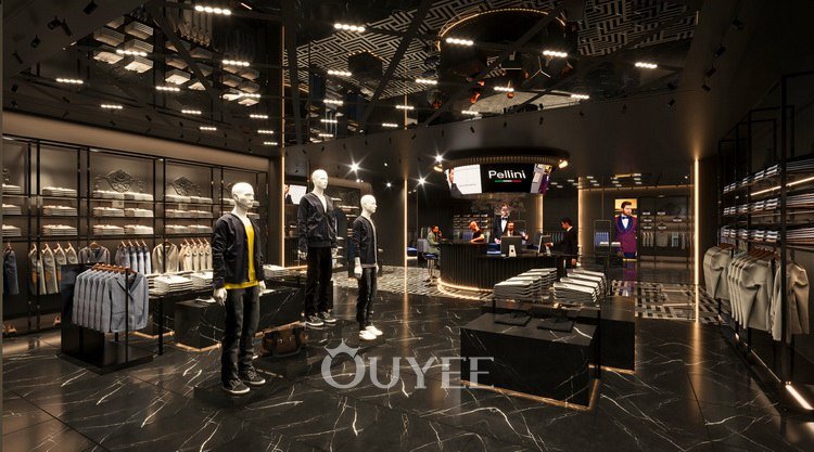 Ouyee 提供します インテリアアイデアとカスタムディスプレイ什器 スペースの美観と顧客体験を向上させたいメンズ衣料店向け。創造性と精密なクラフトマンシップを融合させます。.