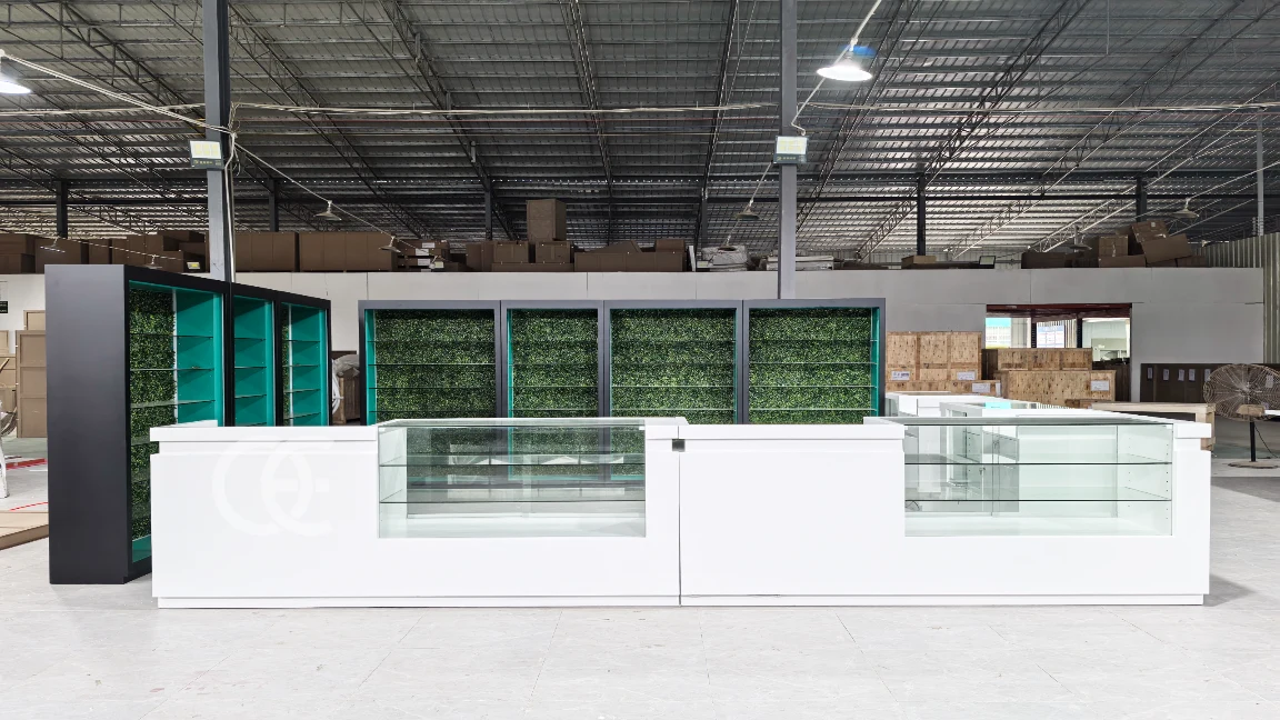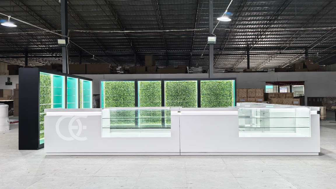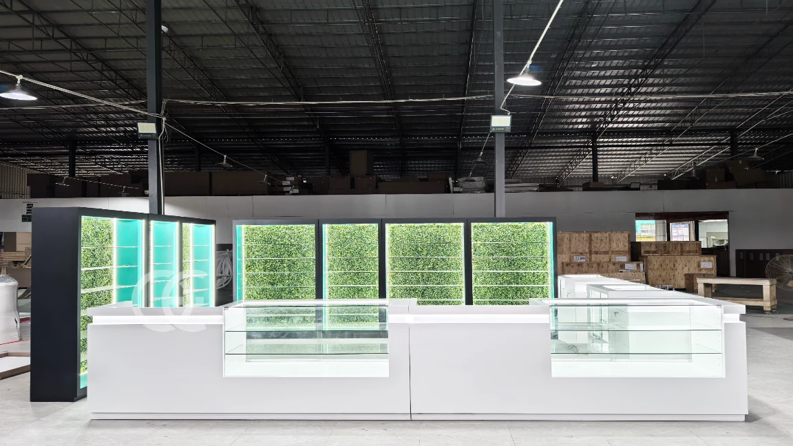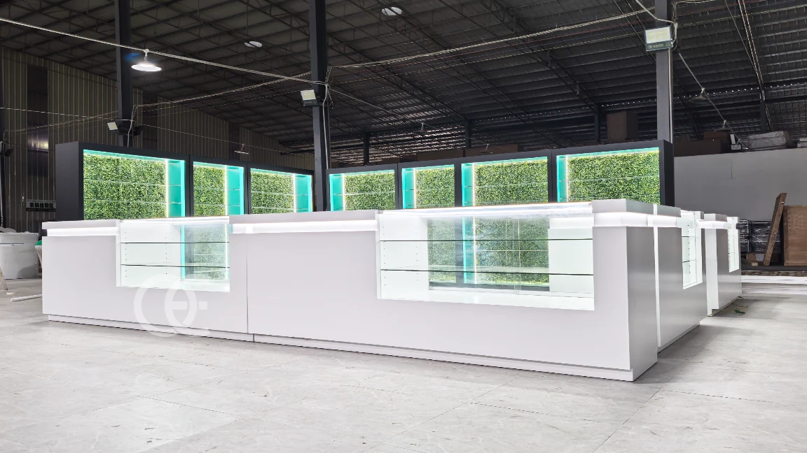 Build a premium, code-ready retail line with Ouyee cabinets that blend low-iron glass showcases, backlit wall systems, and modular POS counters. Optimized for cannabis dispensaries and vape shops, the kit supports clean planograms, fast service, and brand zoning with LED lighting and concealed power.