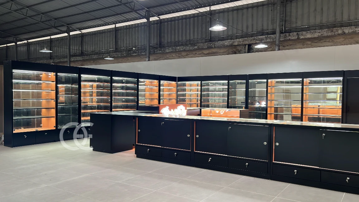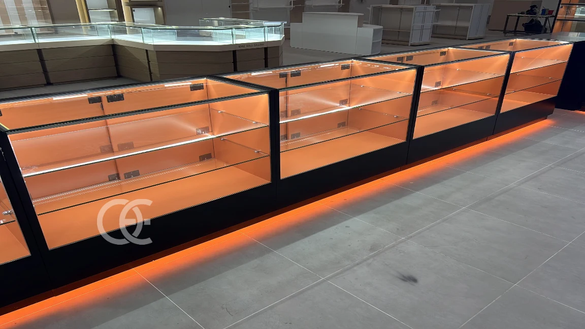 ✅ Full-height glass showcases with lockable storage and anti-reflective panels