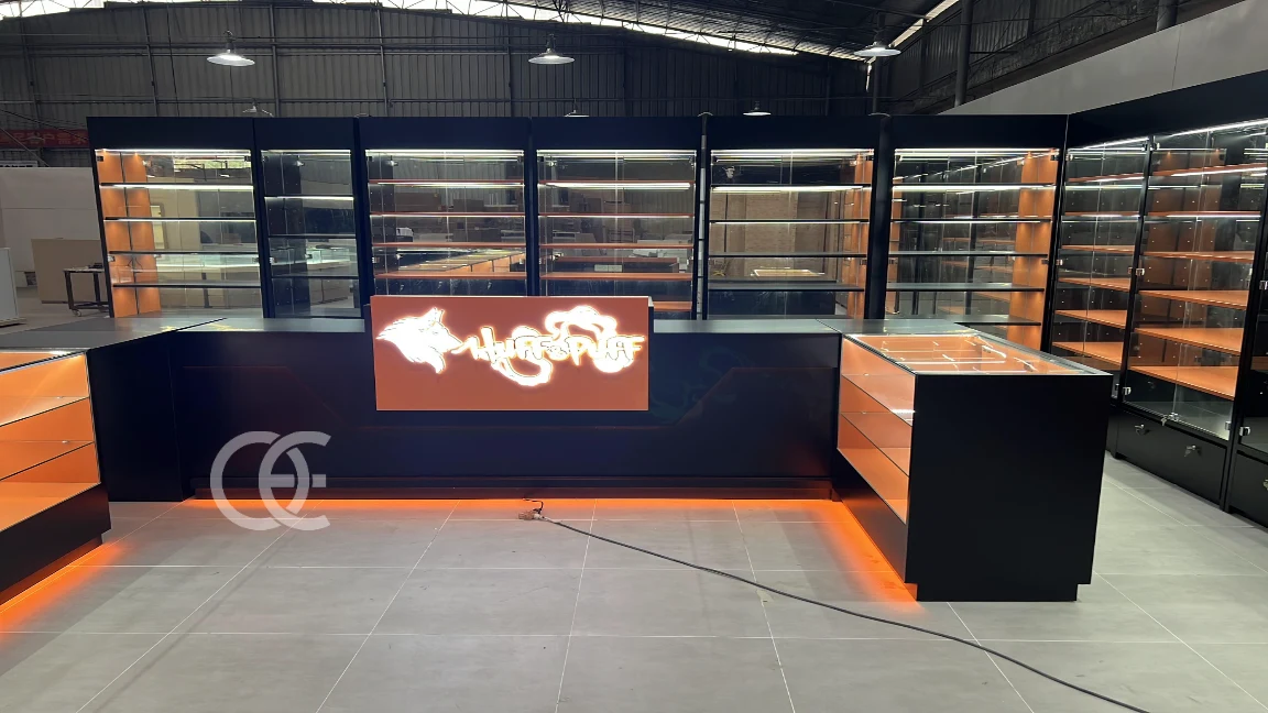 Ouyee creates custom hookah shop display showcases and modern shisha store interiors that combine dark luxury with ambient lighting for a premium retail experience. The elegant balance of matte black cabinetry, orange LED illumination, and glass shelving brings out the sophistication of every product on display.