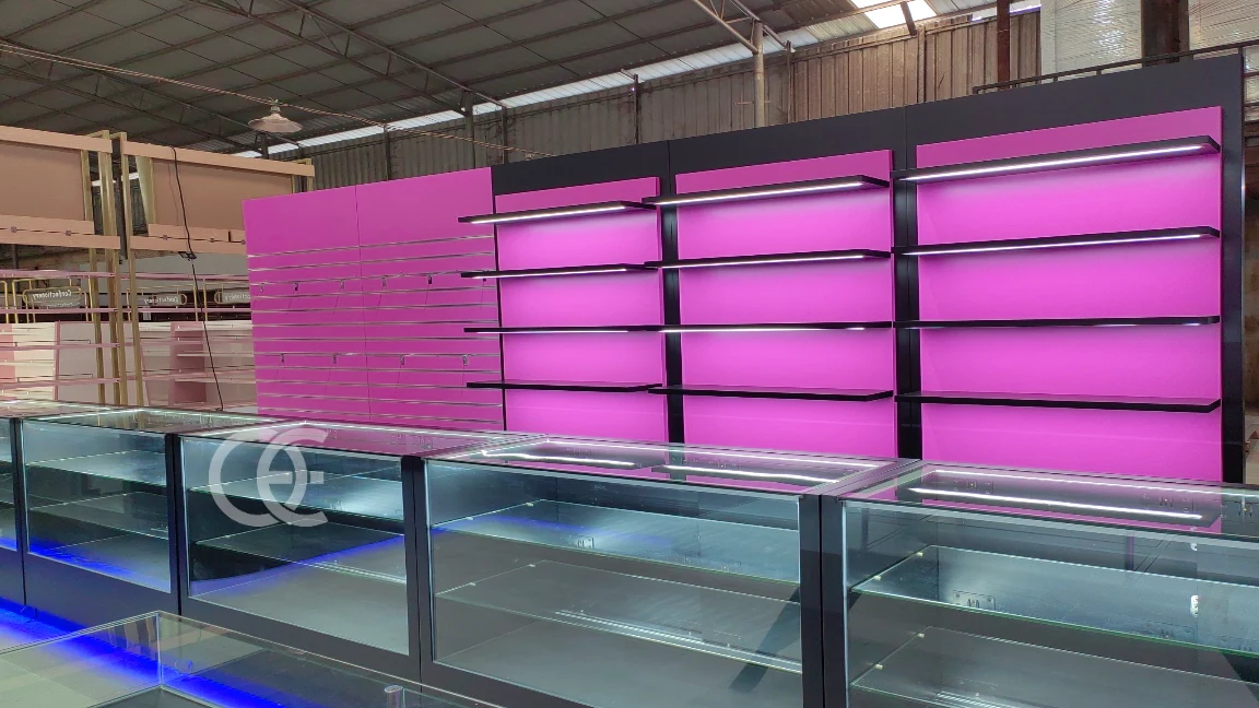 Ouyee designs and manufactures vapor shop display cases and shelves that perfectly combine modern lighting effects with functional retail layouts. This setup features black display counters, glass showcases, and LED-backlit wall shelving in pink and purple tones — creating an energetic and trendy retail vibe ideal for vape and e-cigarette shops.