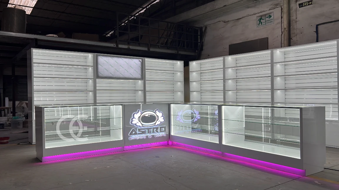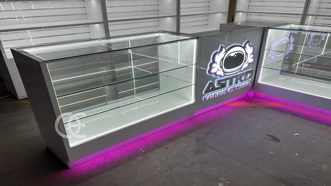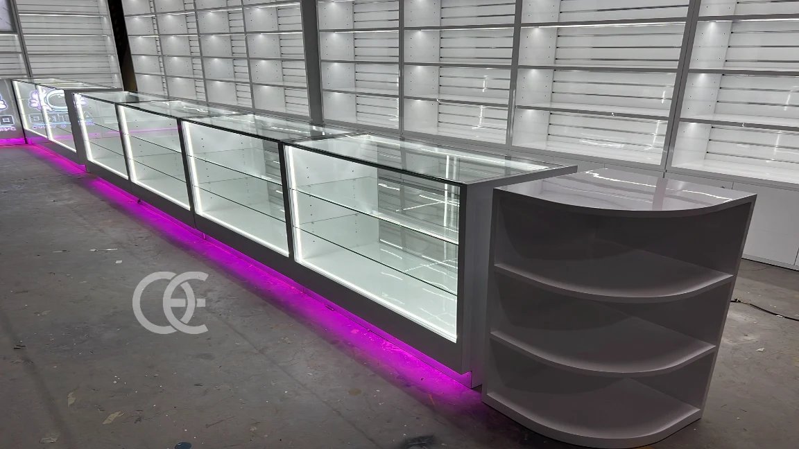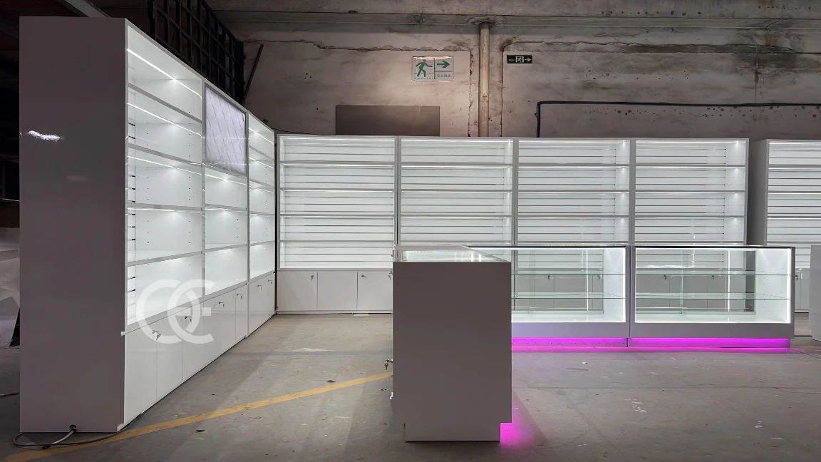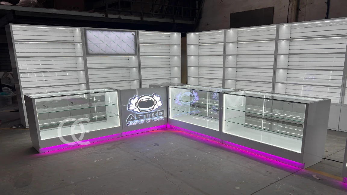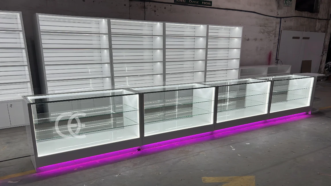 Ouyee manufactures premium marijuana display showcases and smoke shop fixtures for dispensaries and vape retailers across the USA. This white modern setup features LED-lit glass counters and wall shelving that combine function, branding, and ambiance.